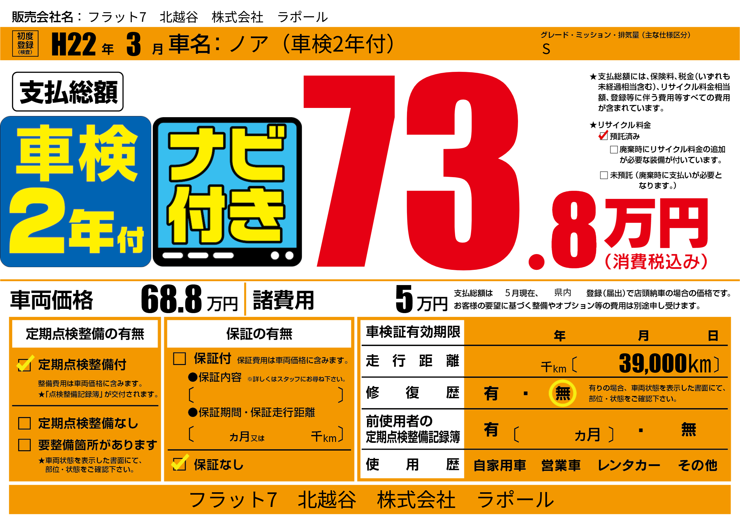 | 走行キロ | - | 初年度登録 | H22年3月 |