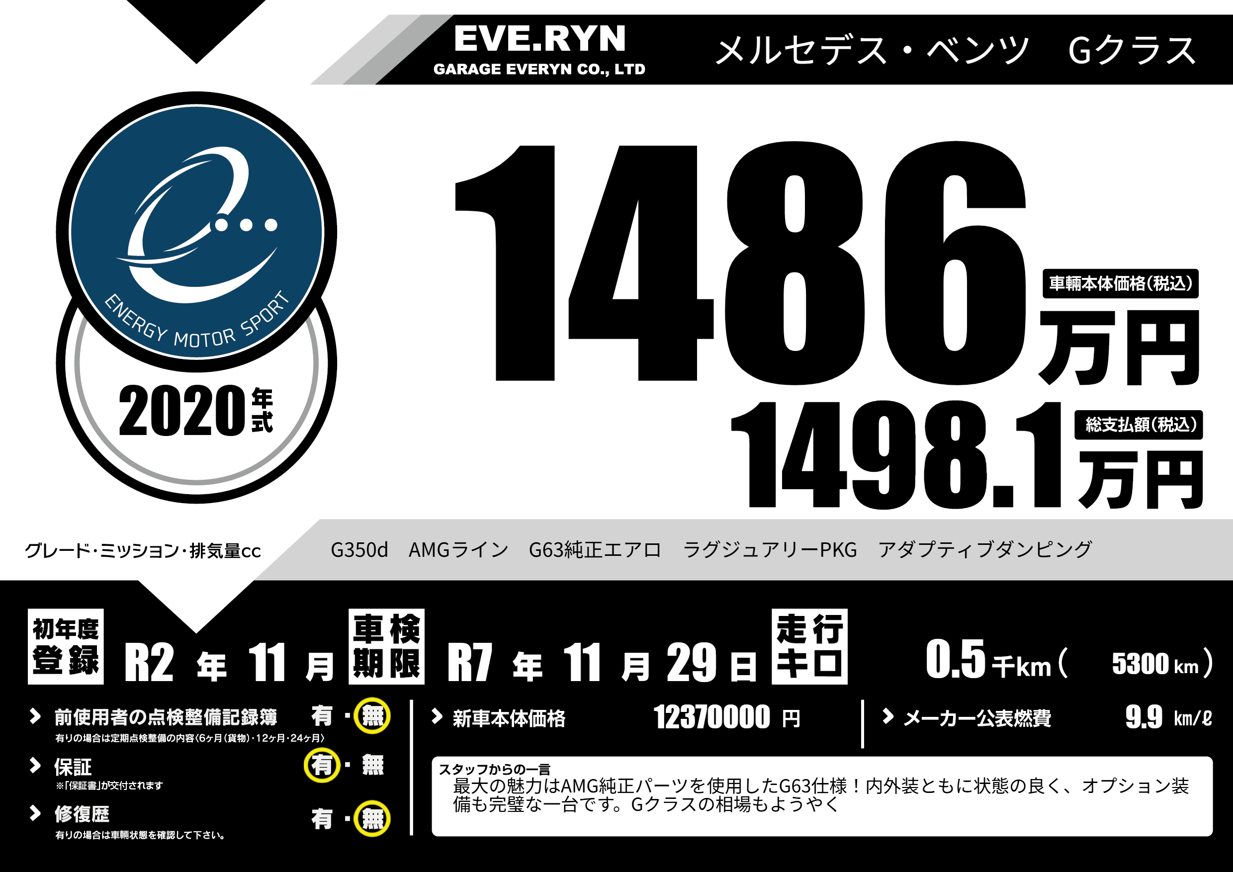 | 車名 | メルセデス・ベンツ Gクラス | グレード ミッション 排気量 |
