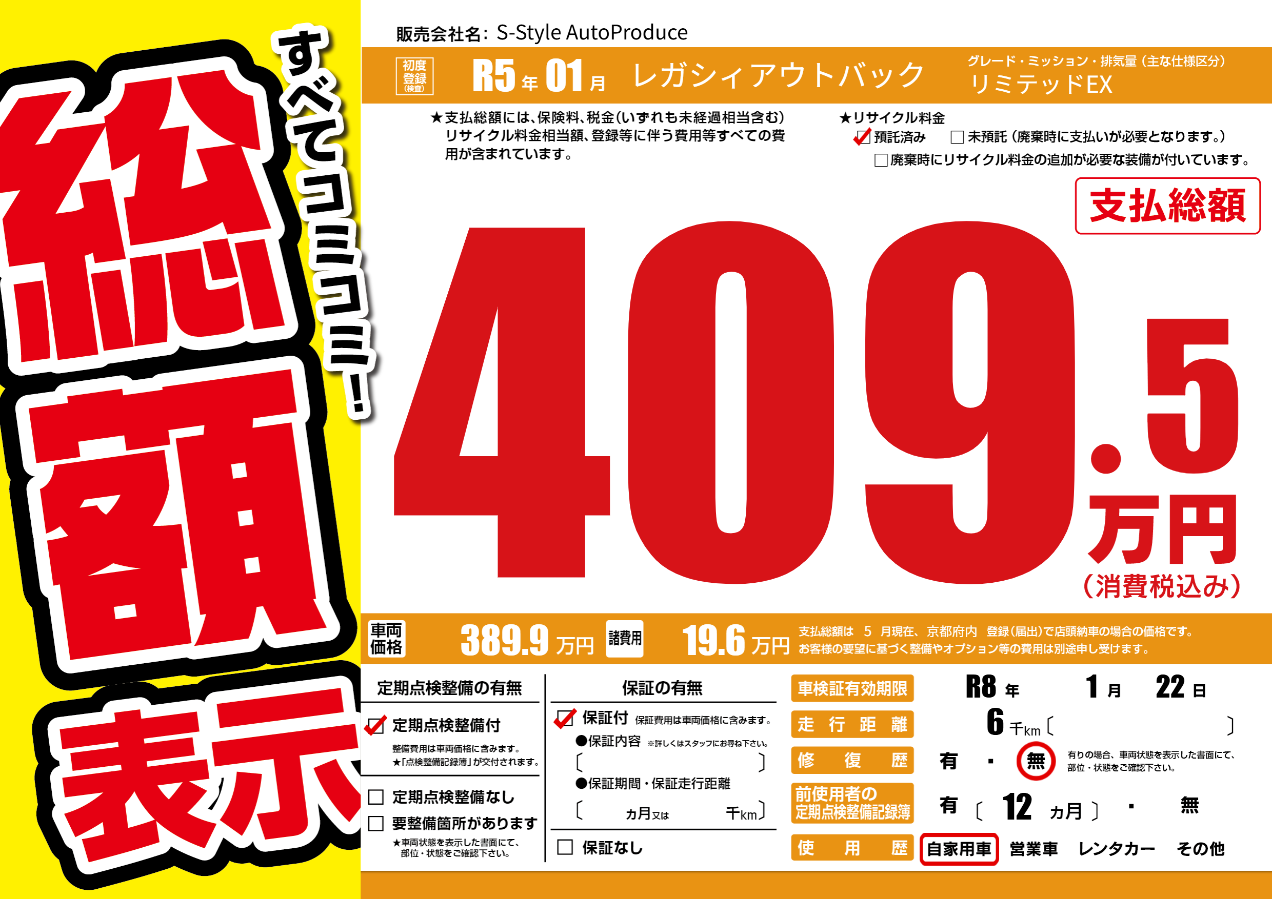 | 車名 | レガシィアウトバック | グレード ミッション 排気量 |
