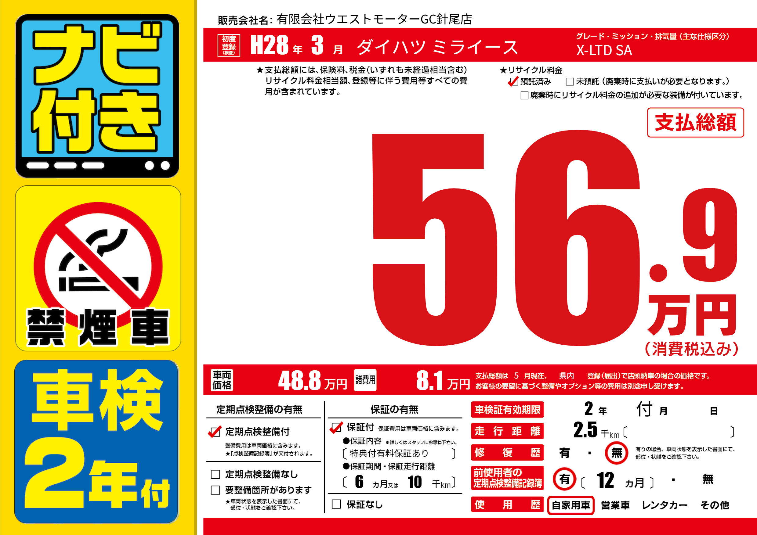 | 車名 | ダイハツ ミライース | グレード ミッション 排気量 |