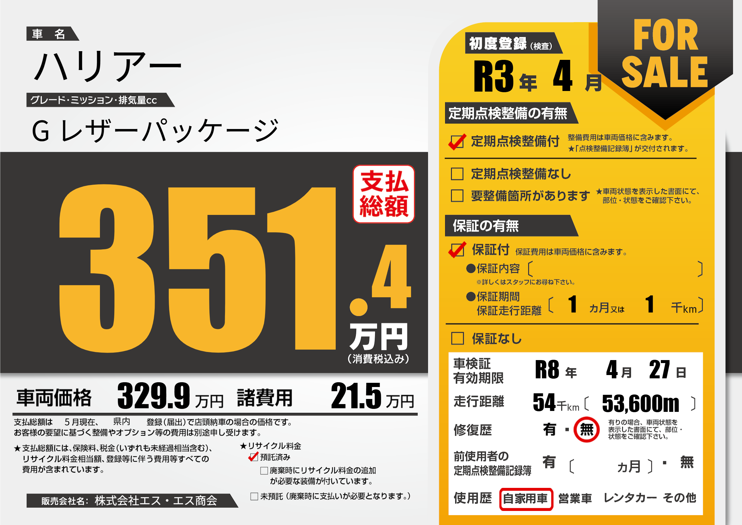 | 走行キロ | 5.4万km | 初年度登録 | R3年4月 |