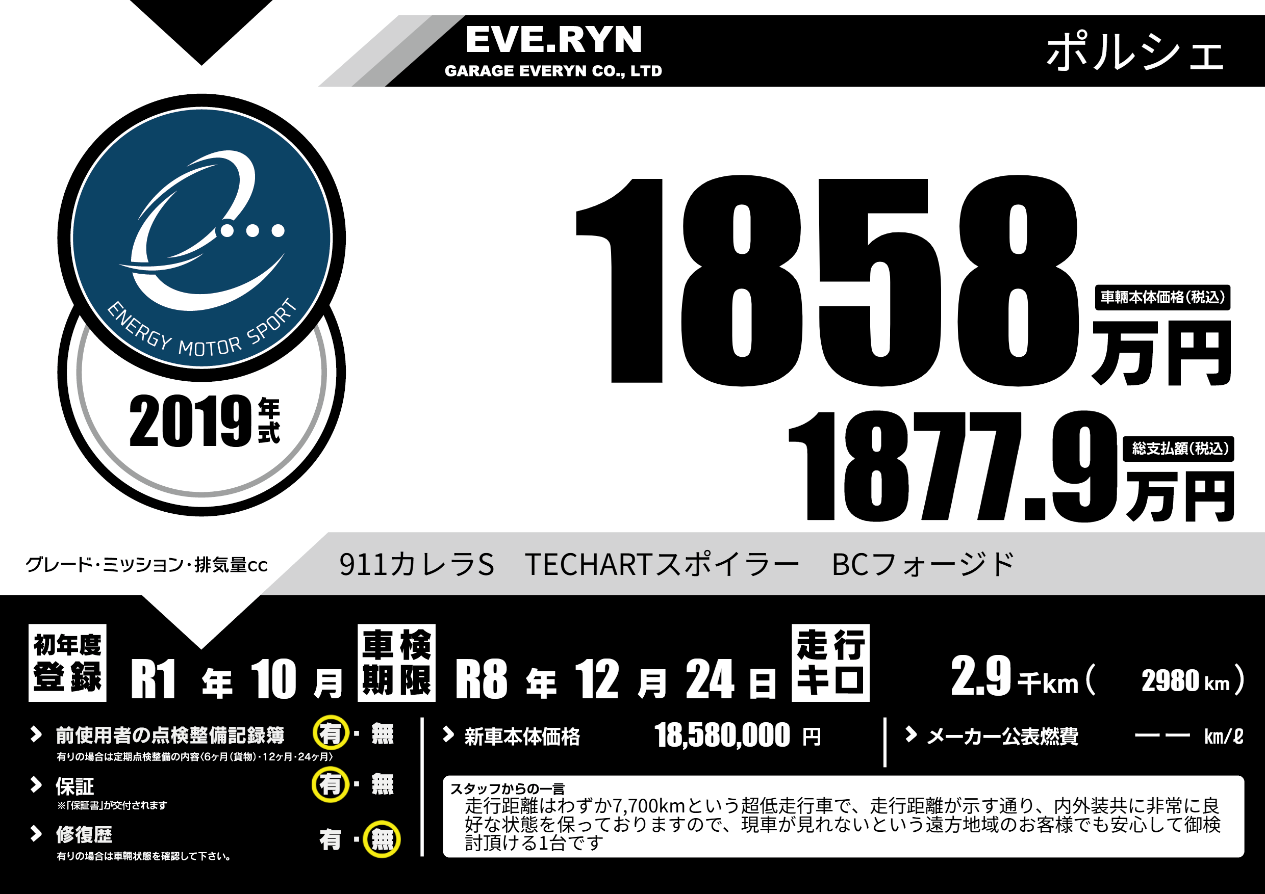 | 走行キロ | 0.2万km | 初年度登録 | R1年10月 |