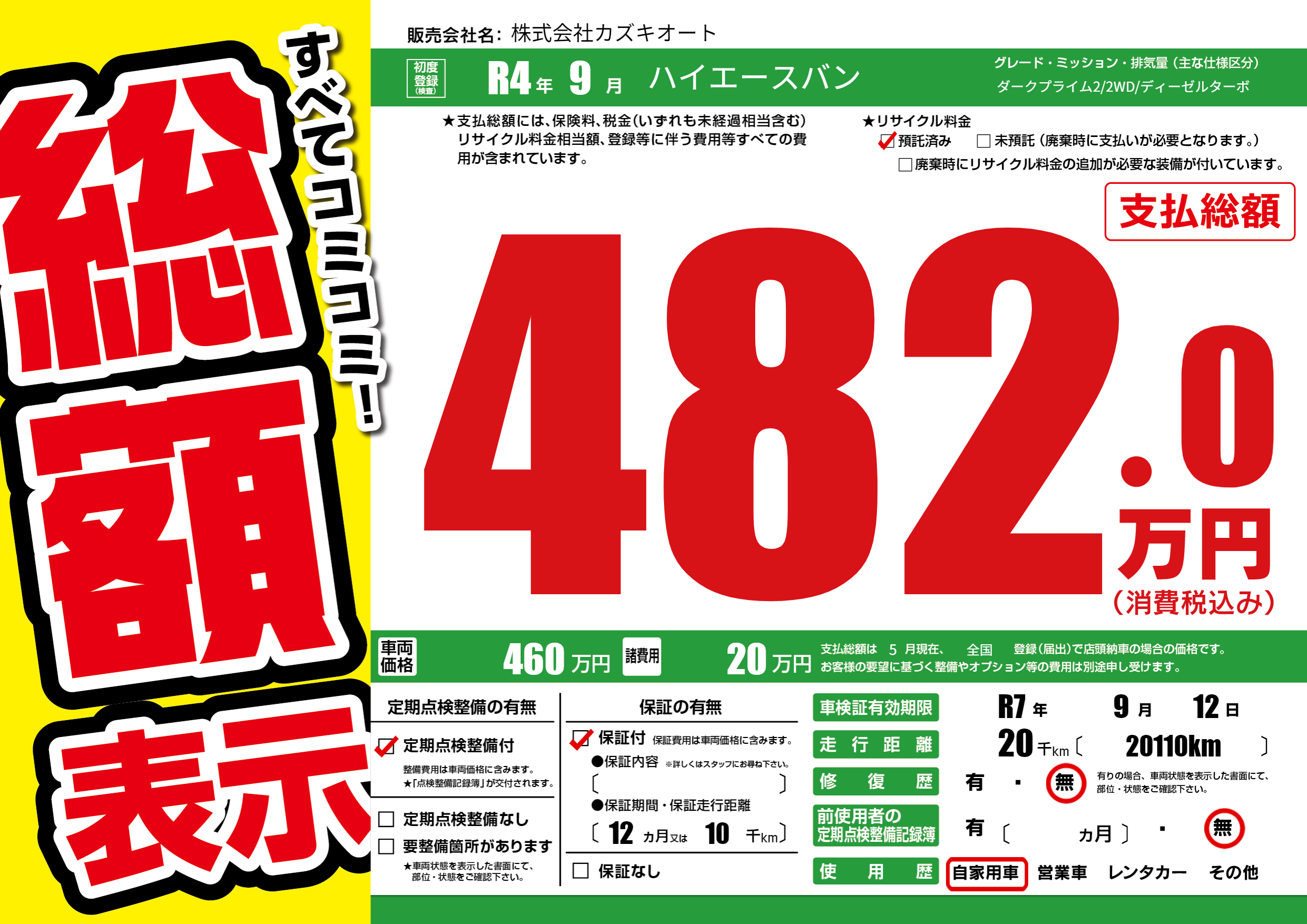 | 車名 | ハイエースバン | グレード ミッション 排気量 |
