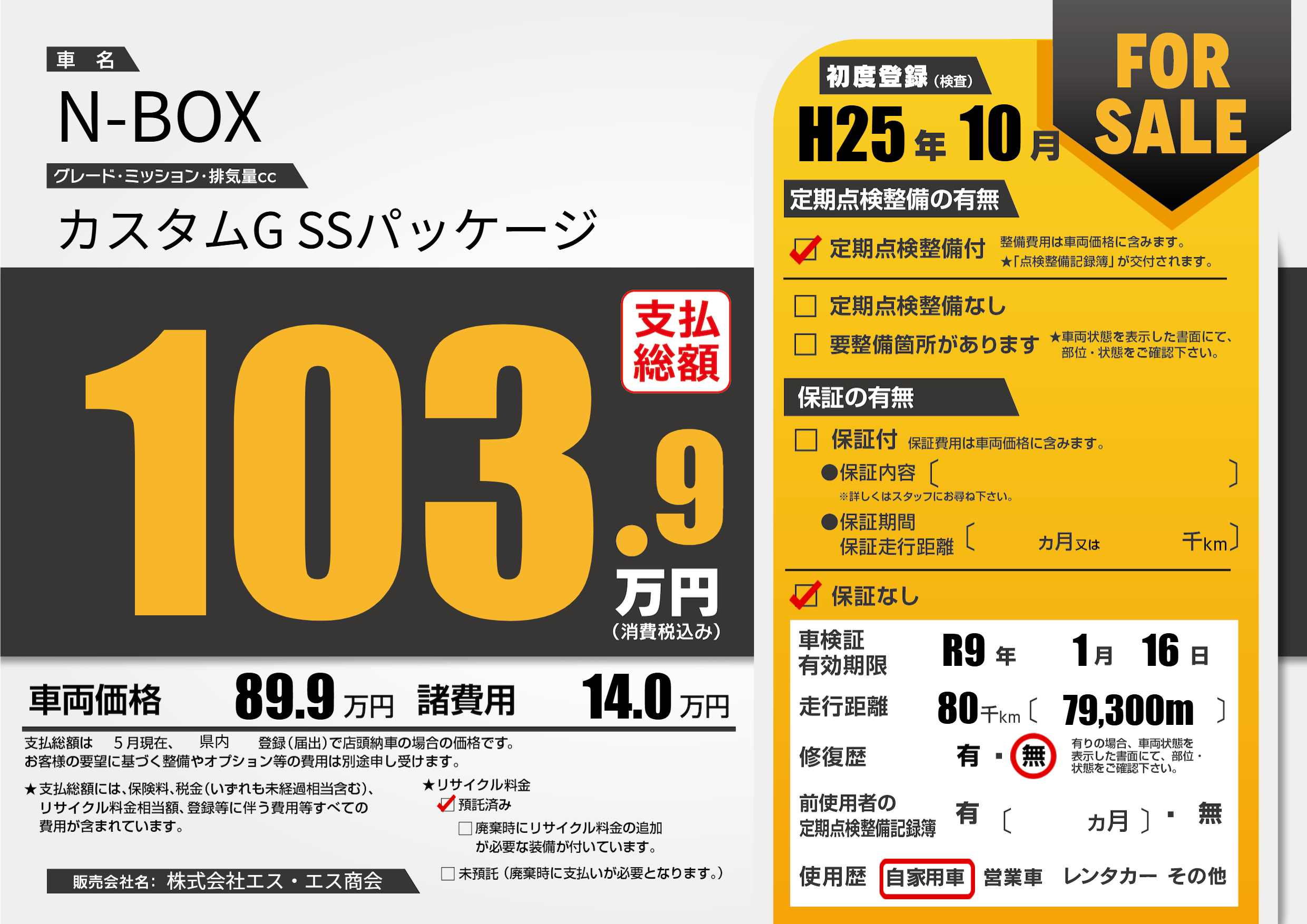 | 車名 | N-BOX | グレード ミッション 排気量 |