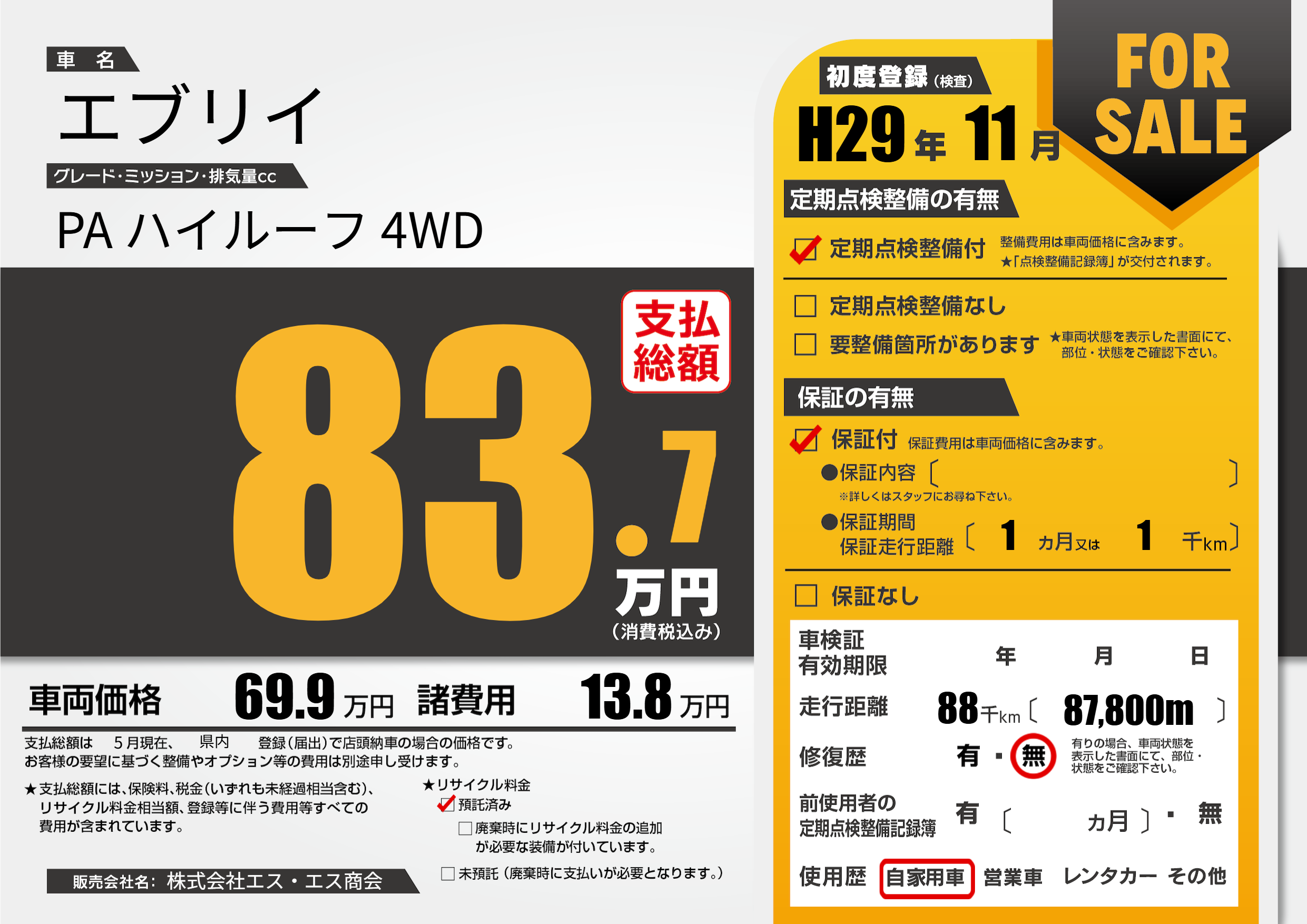 | 走行キロ | 8.8万km | 初年度登録 | H29年11月 |