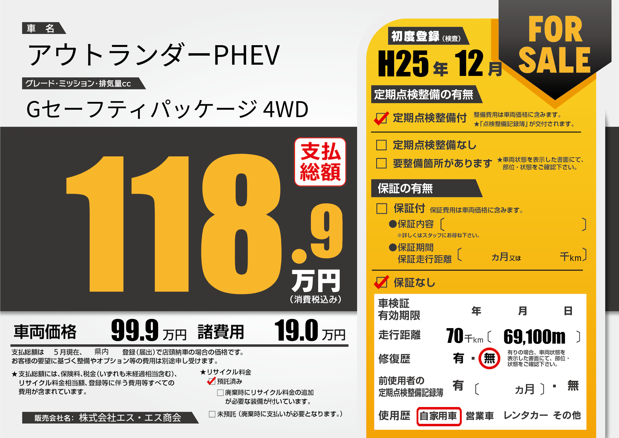 | 車名 | アウトランダーPHEV | グレード ミッション 排気量 |