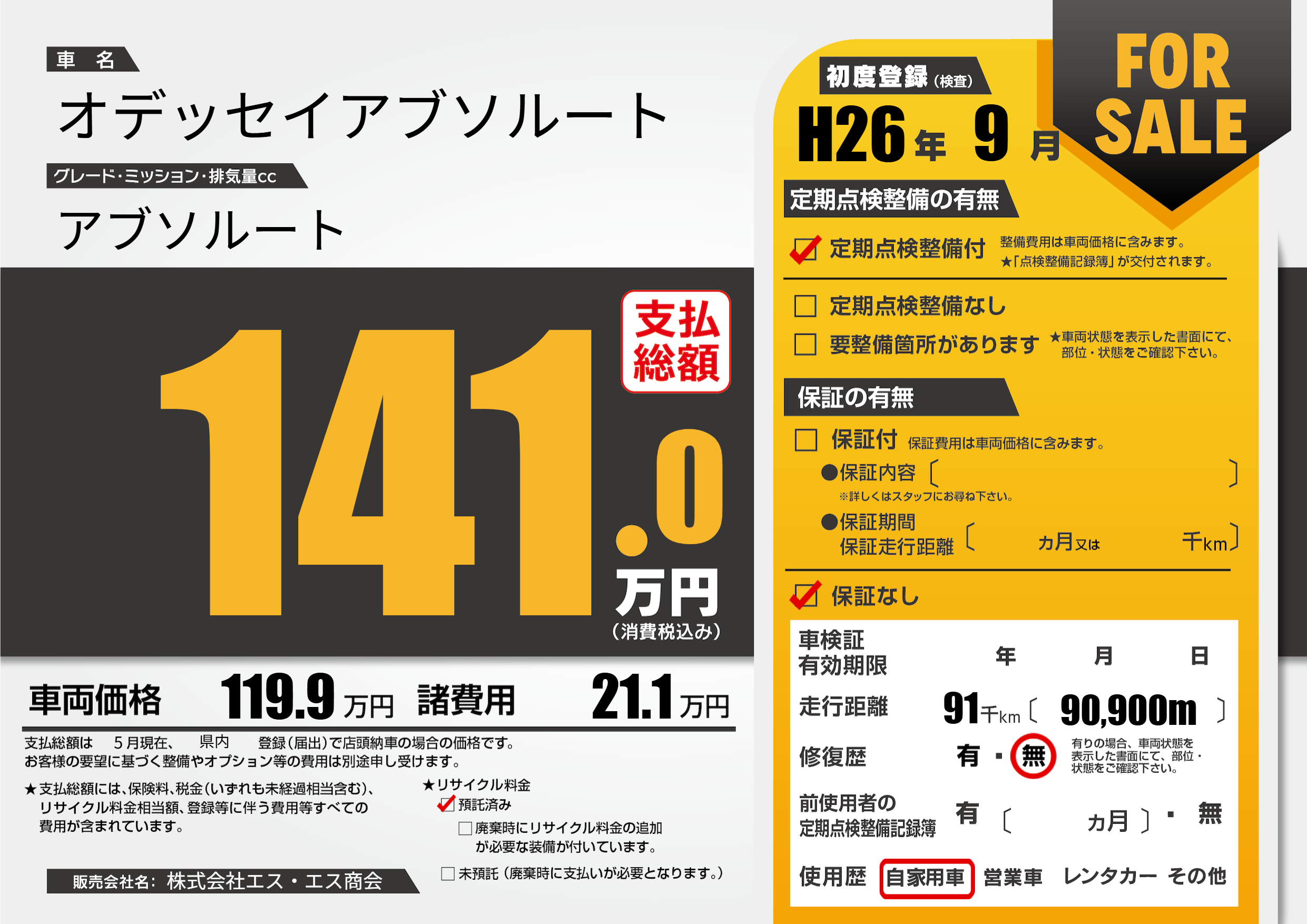| 走行キロ | 9.1万km | 初年度登録 | H26年9月 |