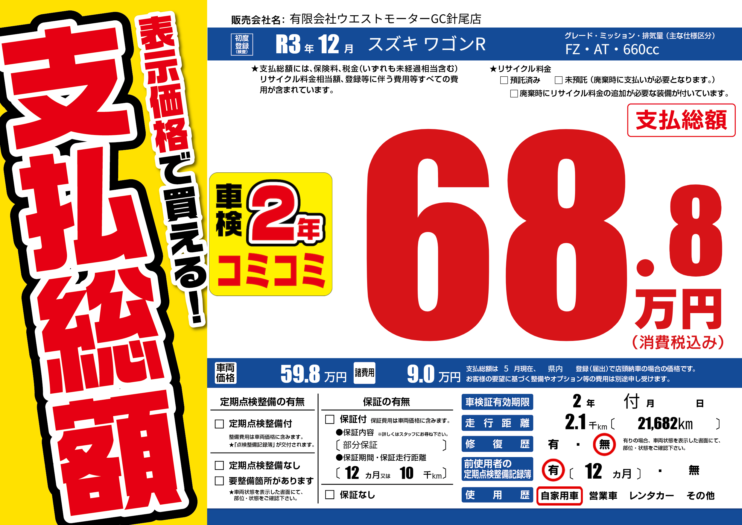 | 車名 | スズキ ワゴンR | グレード ミッション 排気量 |