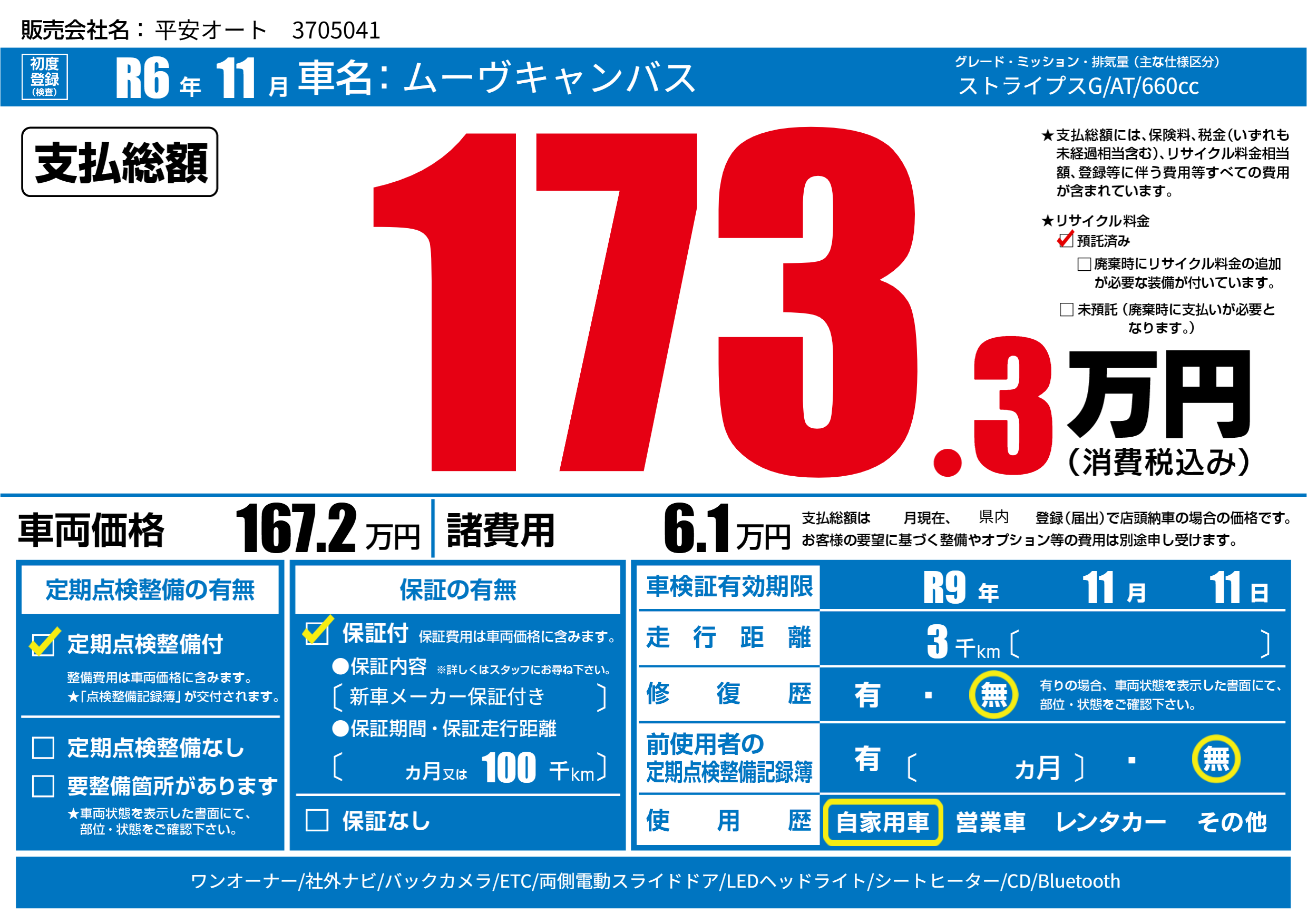 なし | 車検制限 | R9年11月11月 |