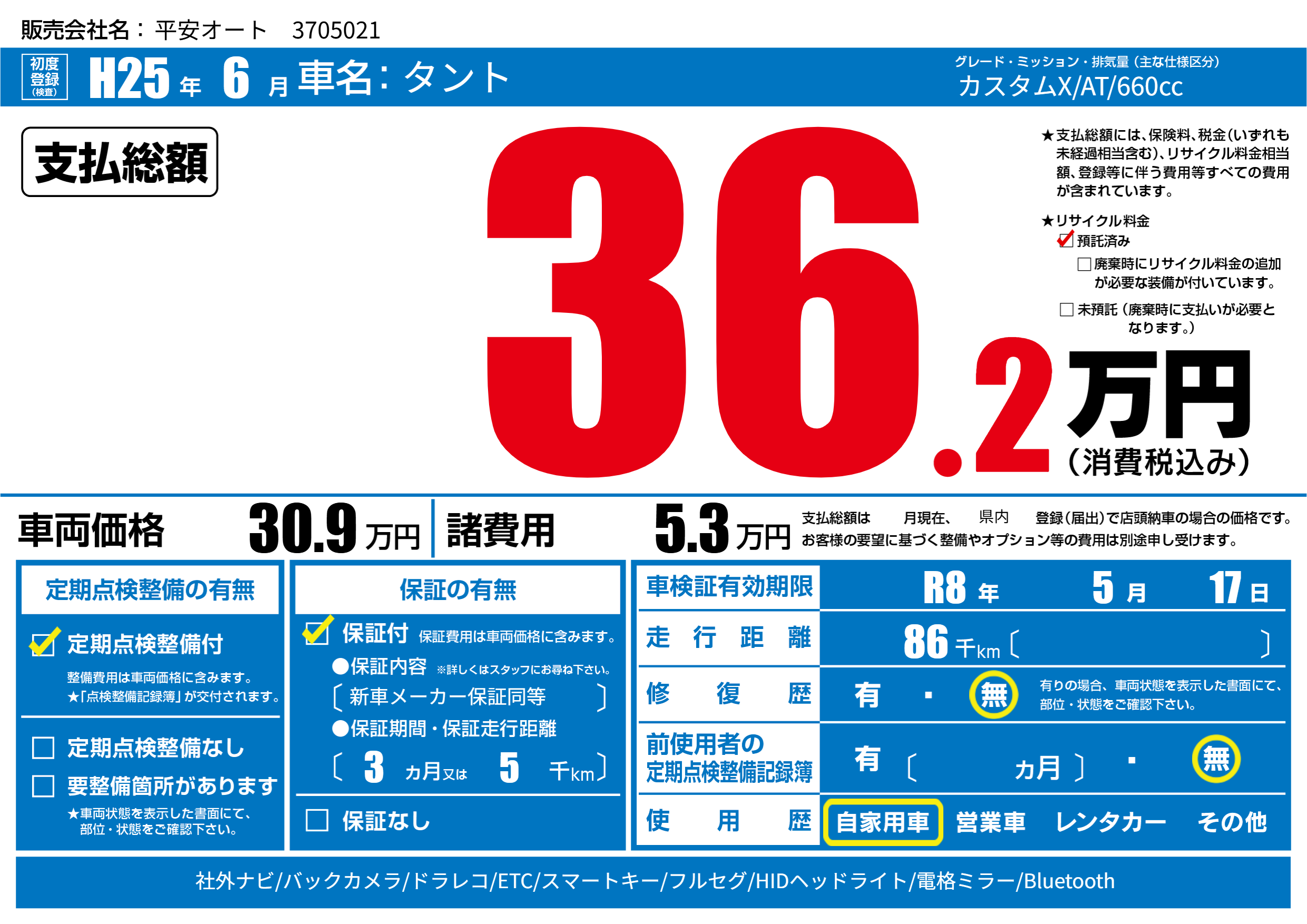| 走行キロ | 8.6万km | 初年度登録 | H25年6月 |