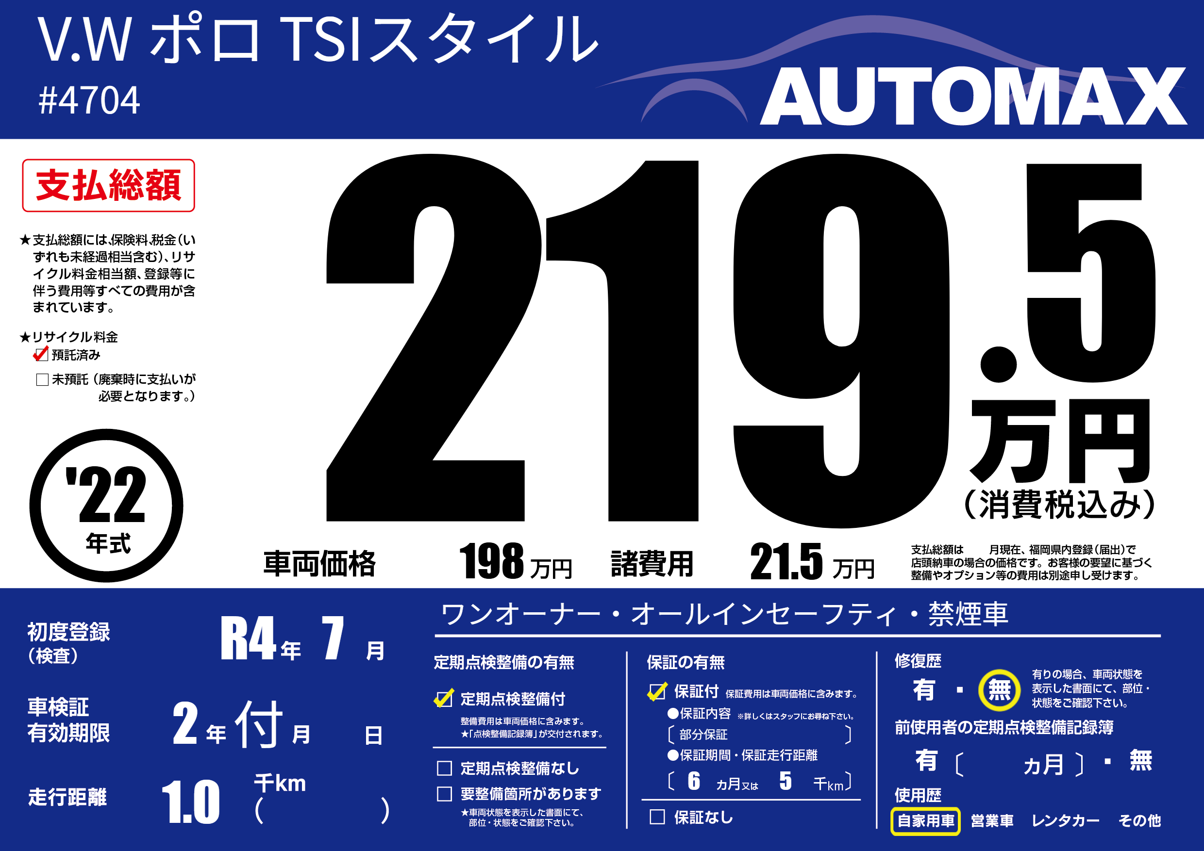 | 車名 | V.W ポロ TSIスタイル | グレード ミッション 排気量 |