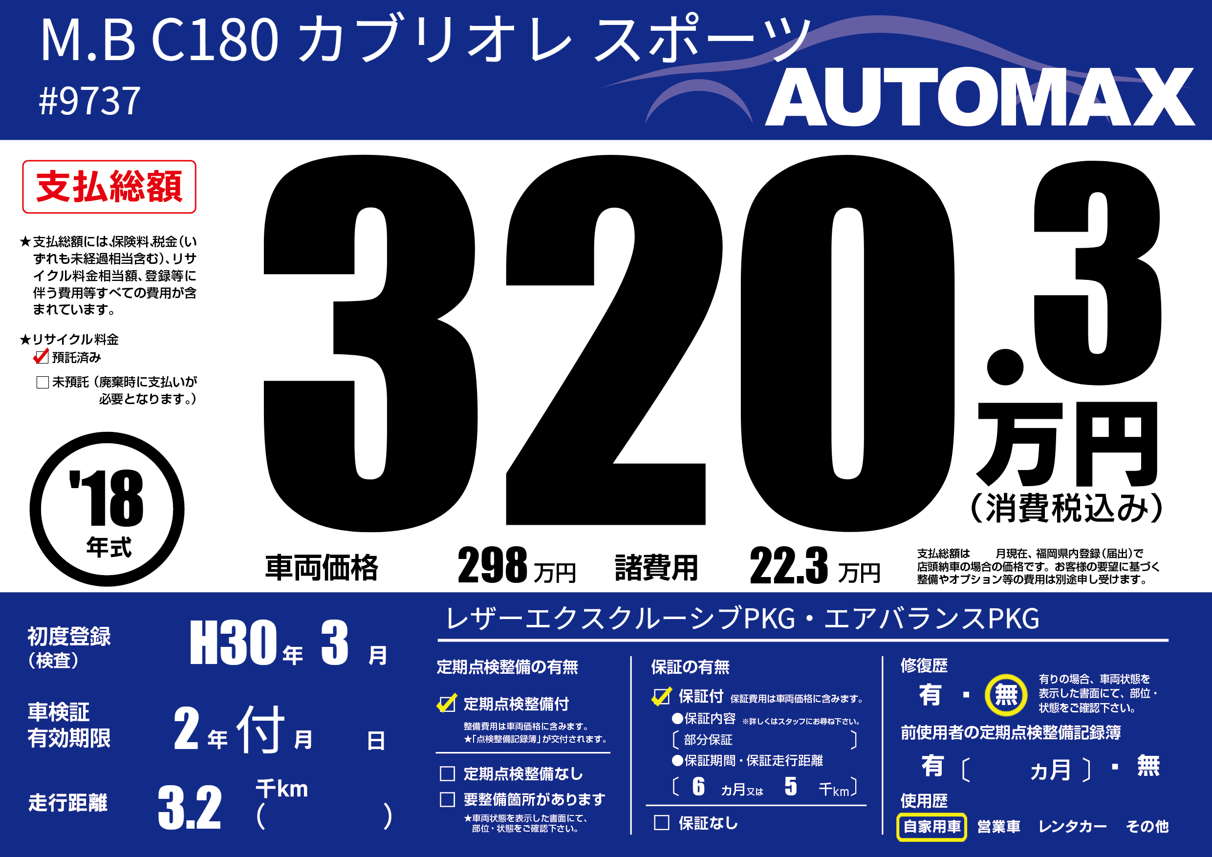 | 車名 | M.B C180 カブリオレ スポーツ | グレード ミッション 排気量 |