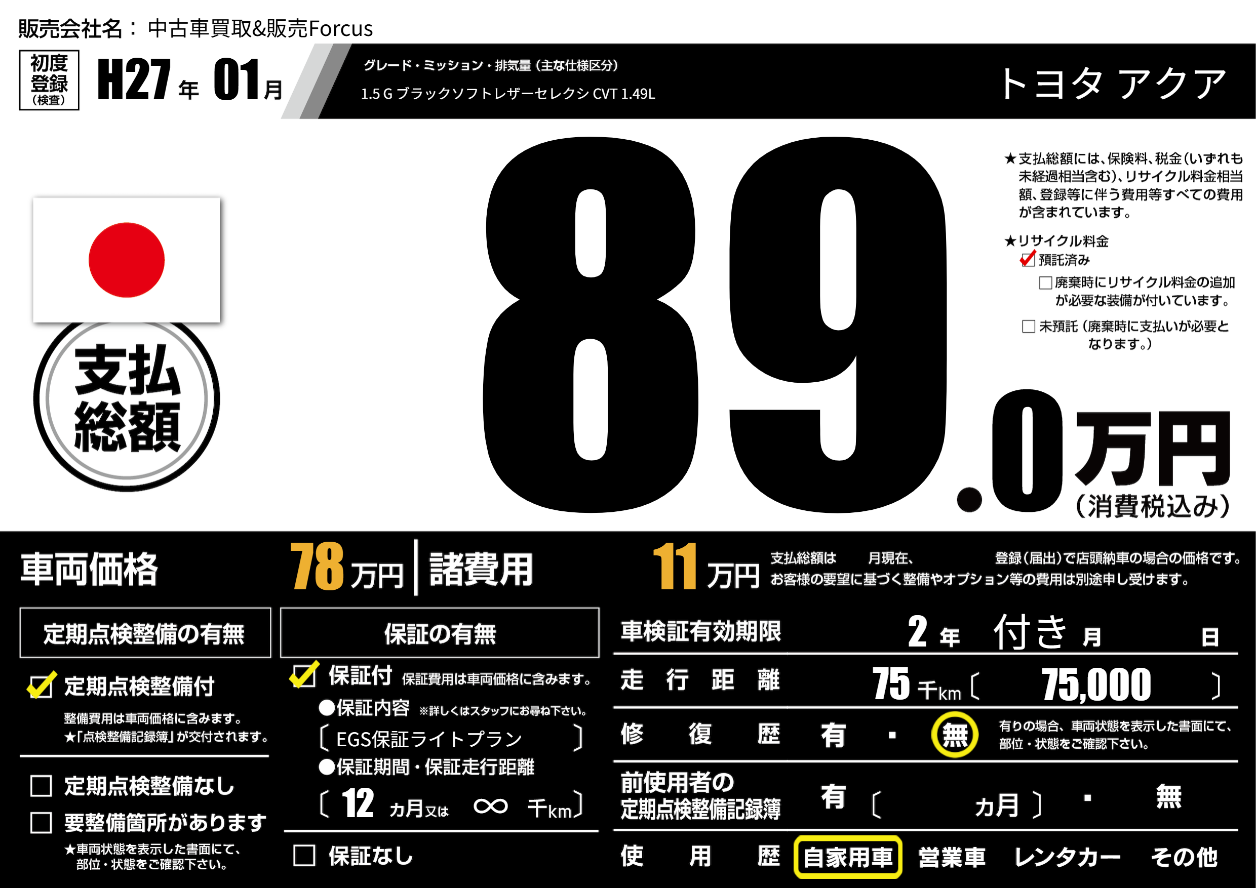 | 車名 | トヨタ アクア | グレード ミッション 排気量 |