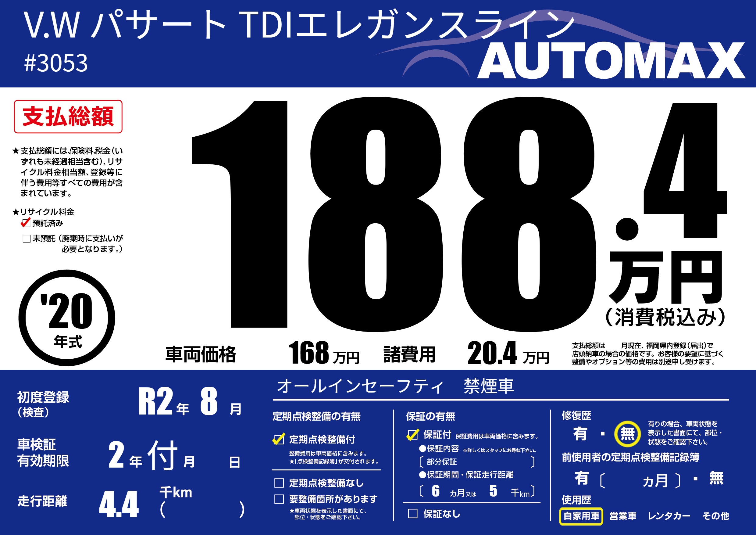 | 車名 | V.W パサート TDIエレガンスライン | グレード ミッション 排気量 |