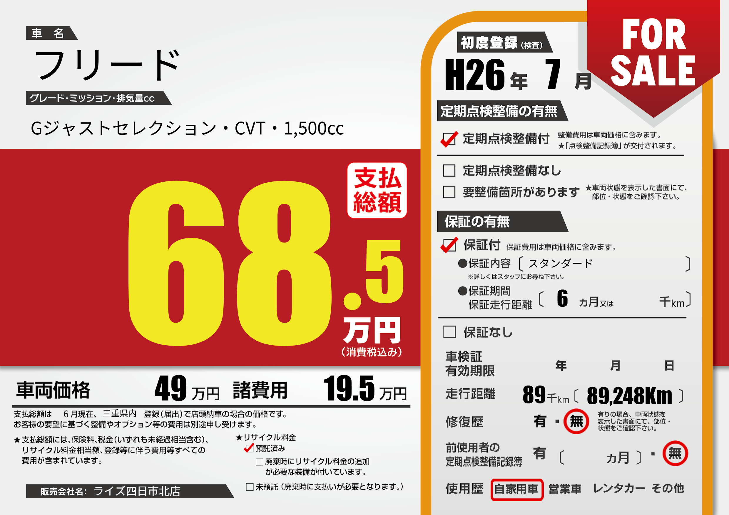 | 車名 | フリード | グレード ミッション 排気量 |