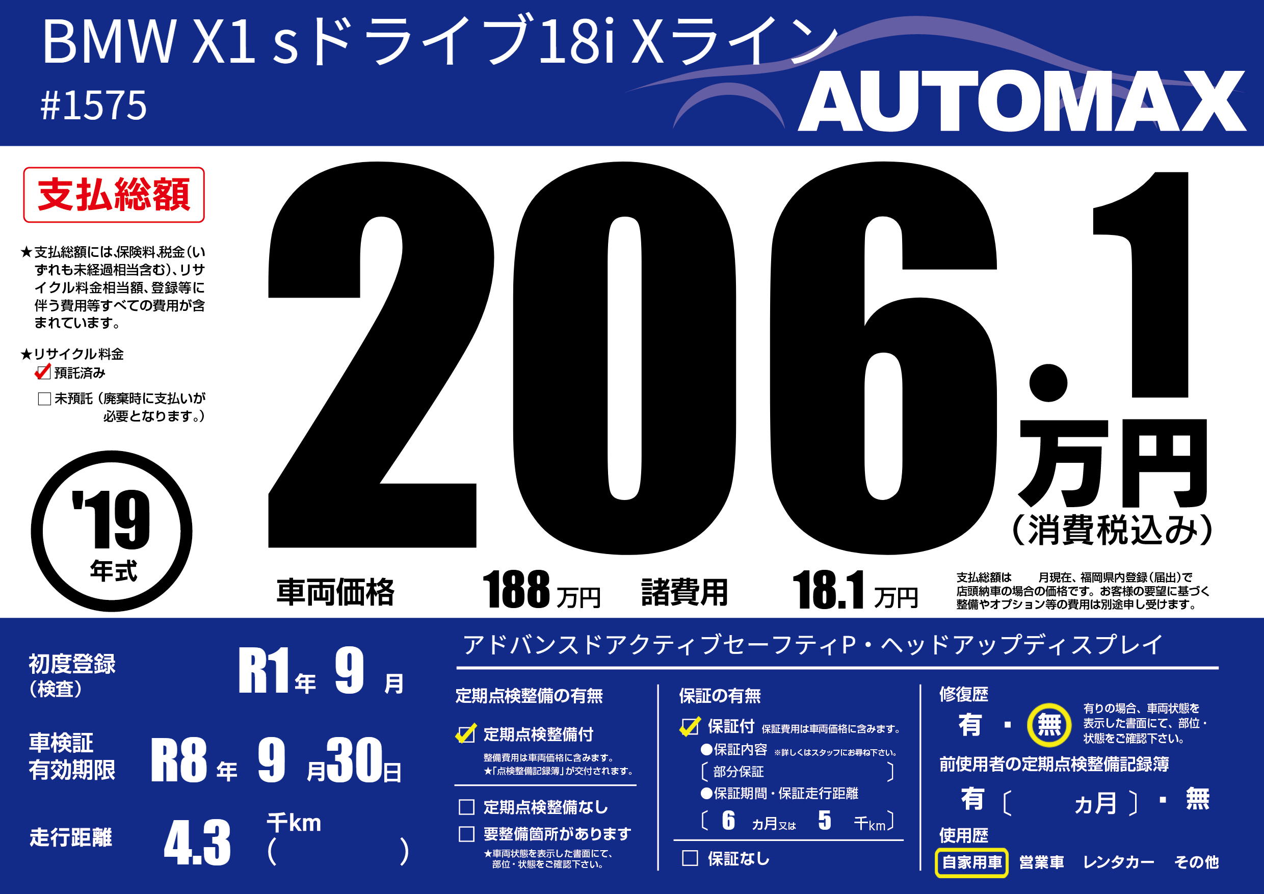 | 車名 | BMW X1 sドライブ18i Xライン | グレード ミッション 排気量 |