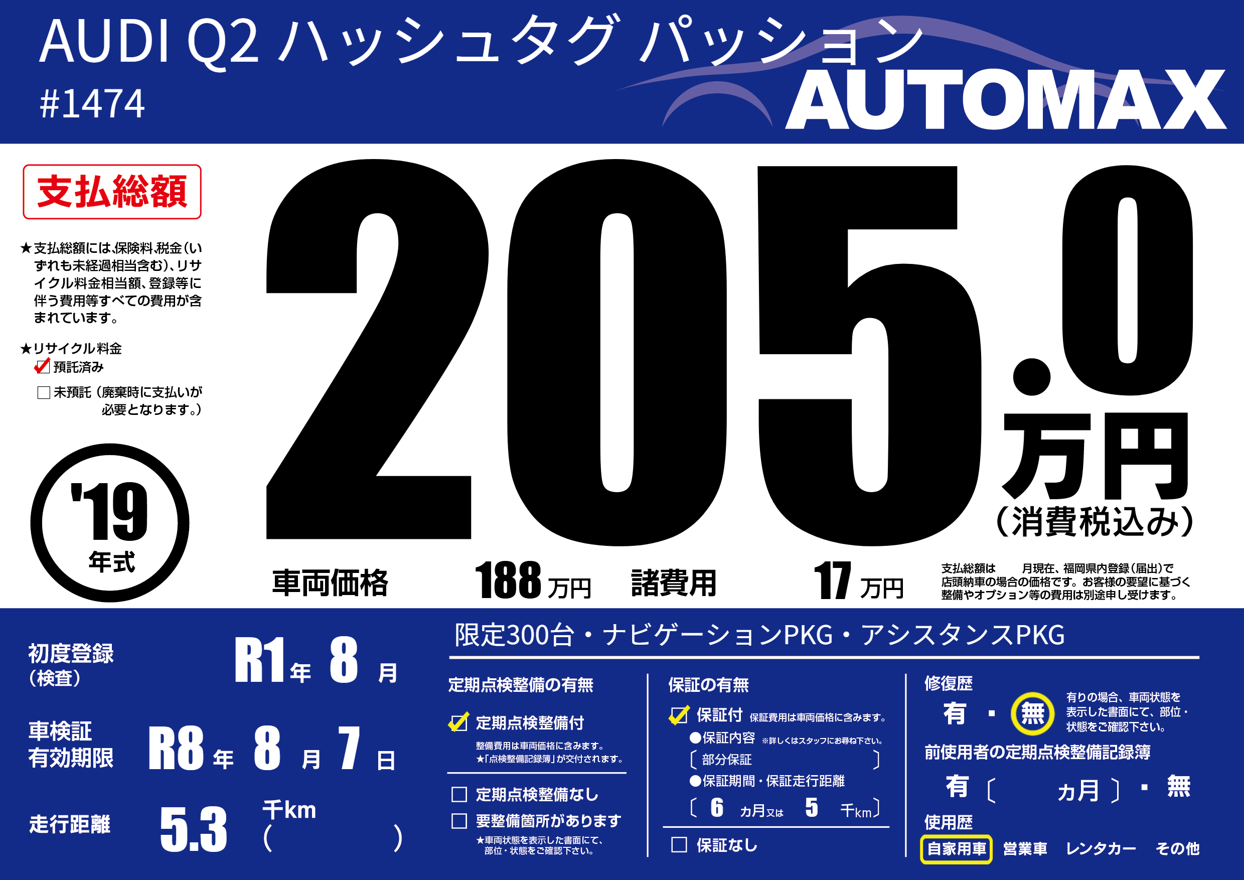 | 車名 | AUDI Q2 ハッシュタグ パッション | グレード ミッション 排気量 |