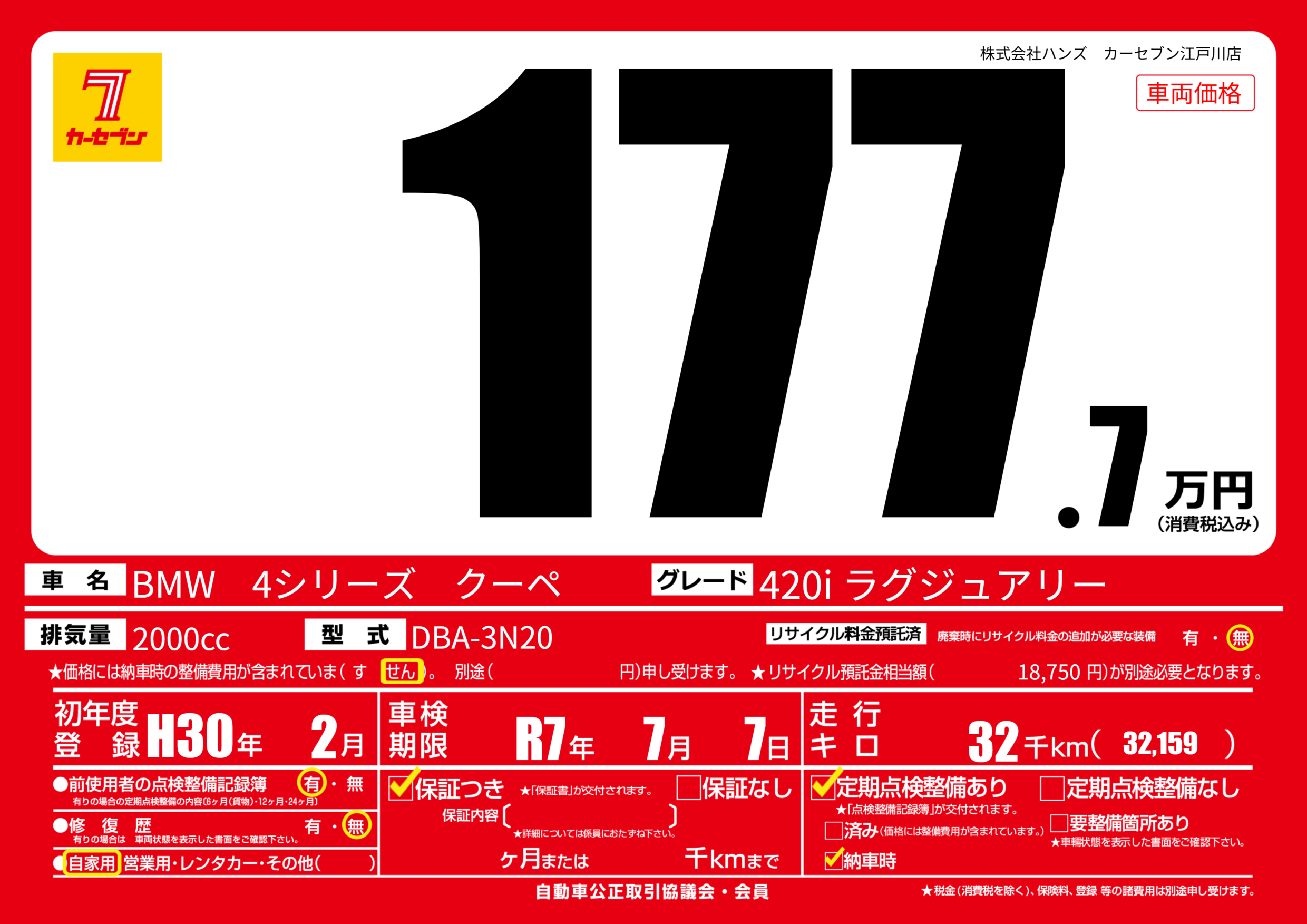 | 車名 | BMW 4シリーズ クーペ | グレード ミッション 排気量 |