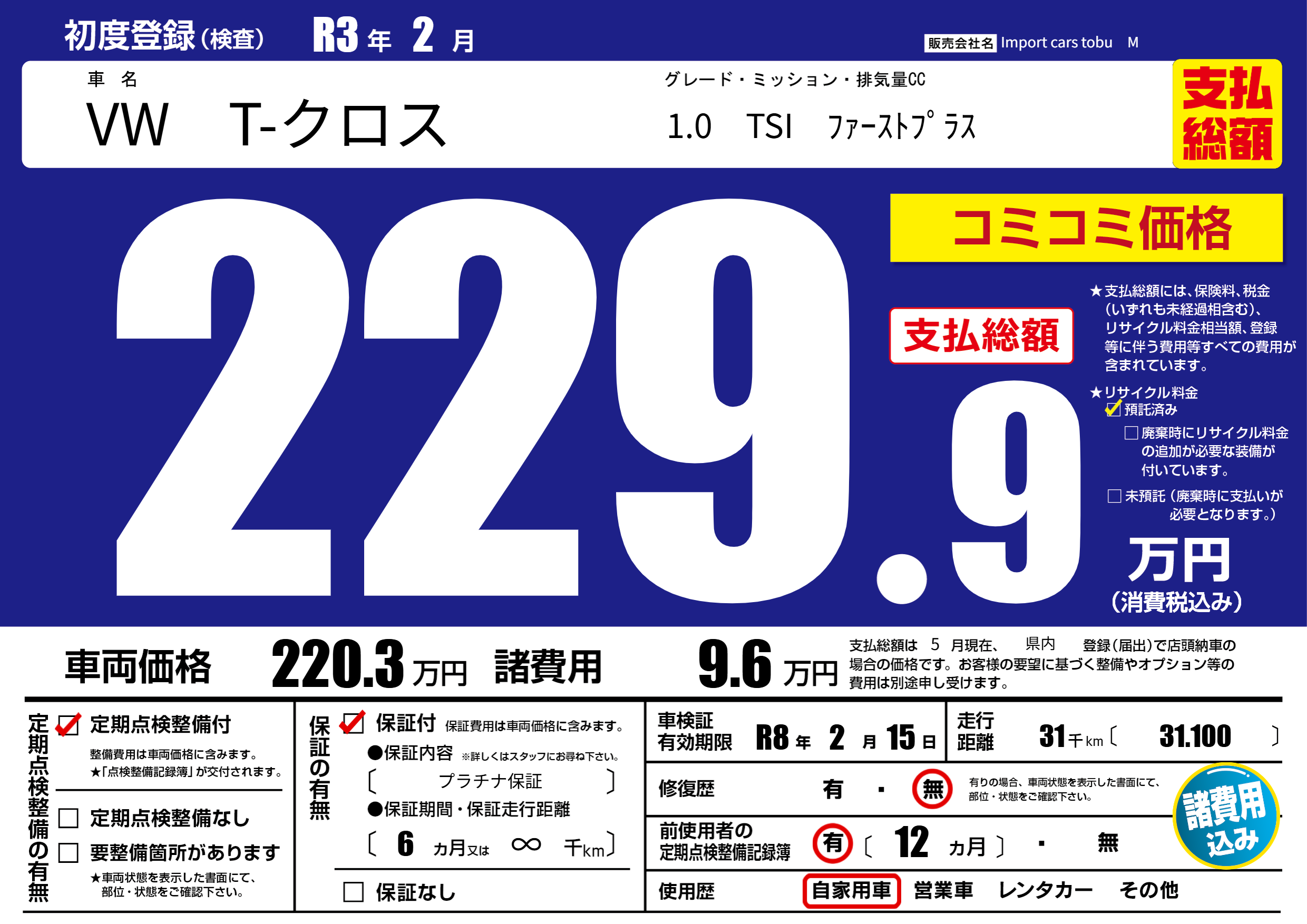 | 車名 | VW T-クロス | グレード ミッション 排気量 |