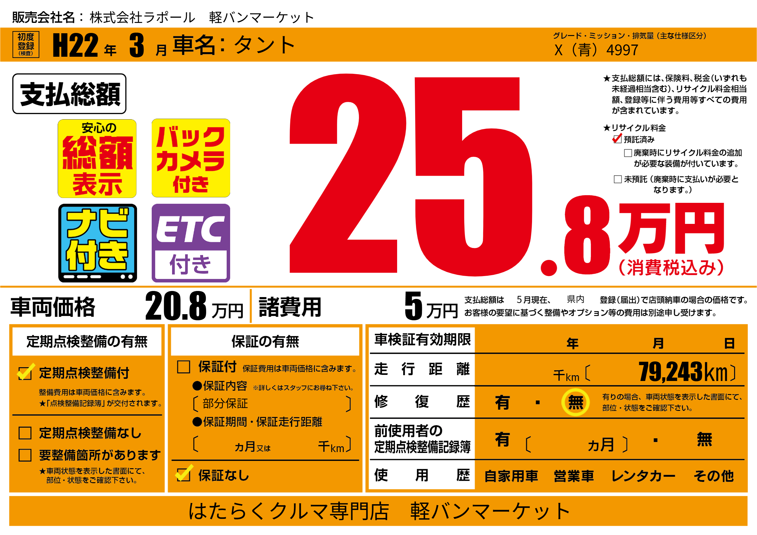 | 走行キロ | - | 初年度登録 | H22年3月 |