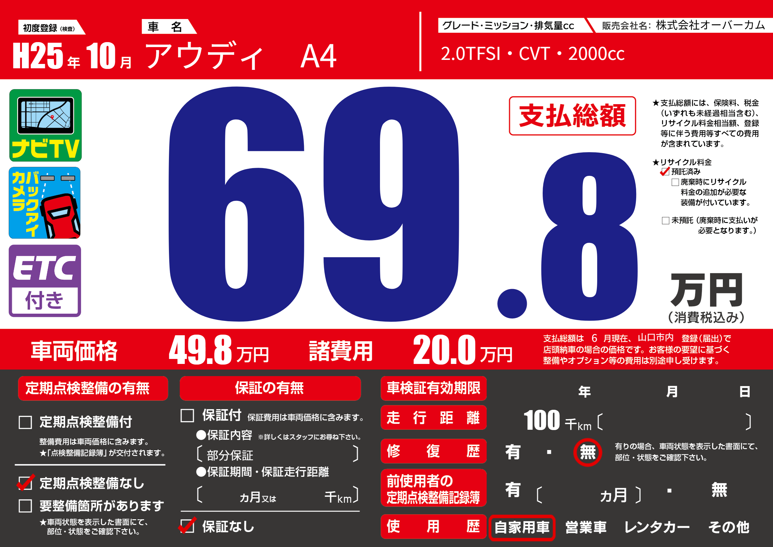 | 車名 | アウディ A4 | グレード ミッション 排気量 |