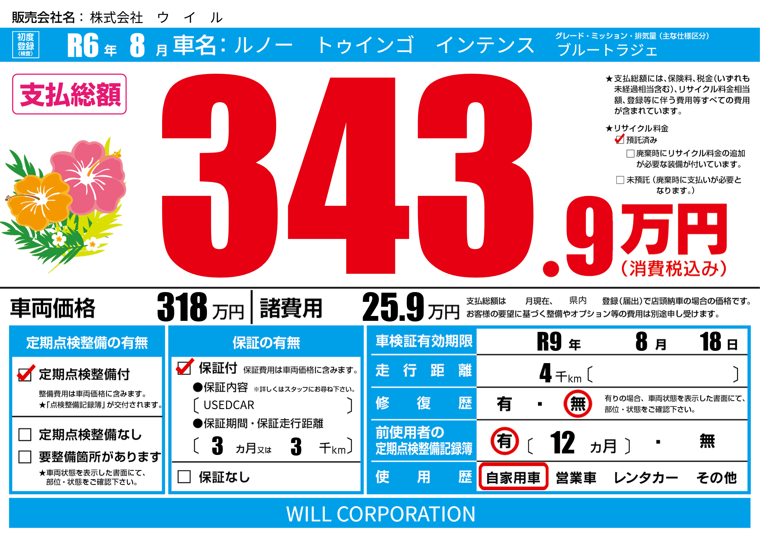 | 走行キロ | 0.4万km | 初年度登録 | R6年8月 |