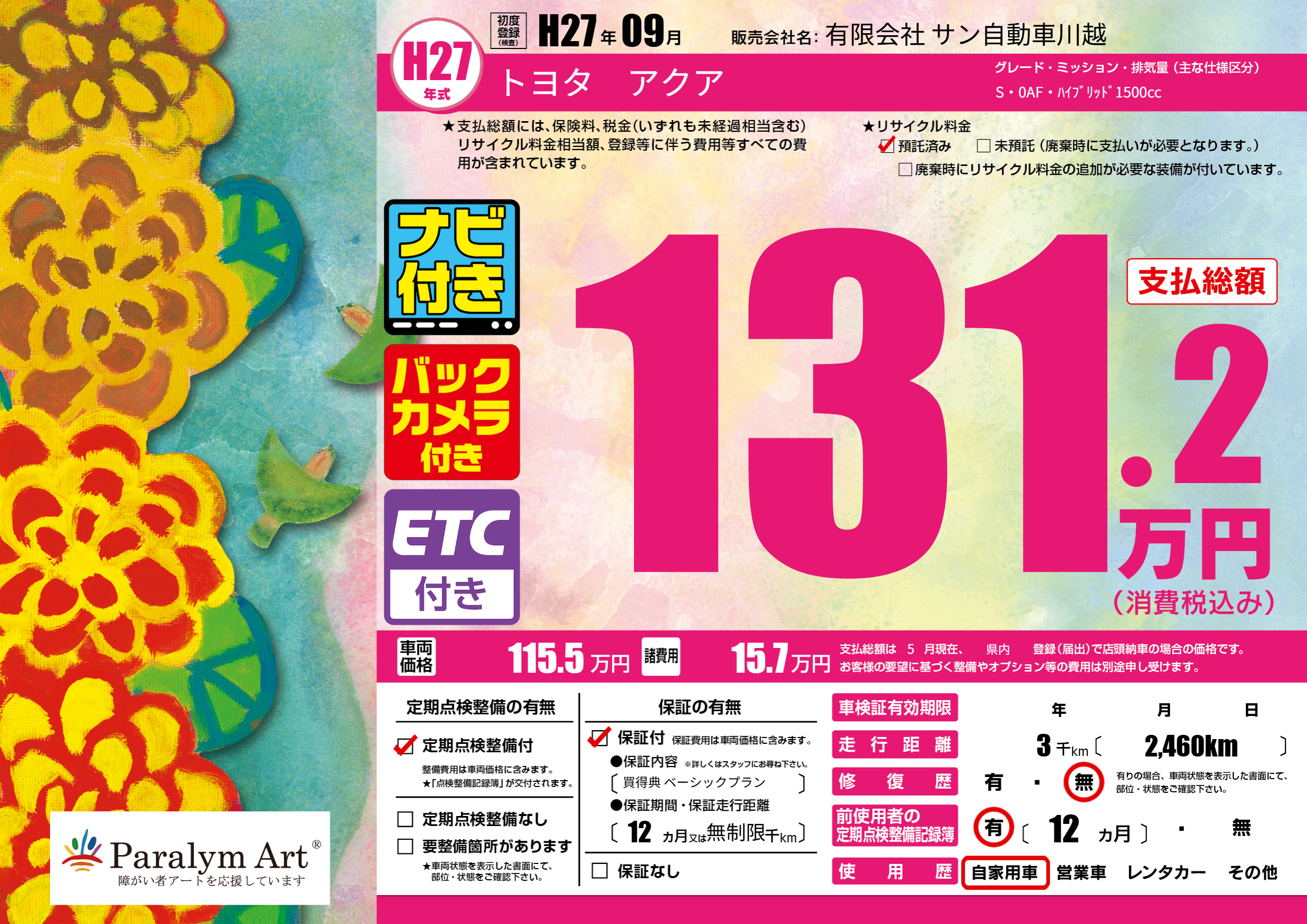 | 走行キロ | 0.3万km | 初年度登録 | H27年09月 |