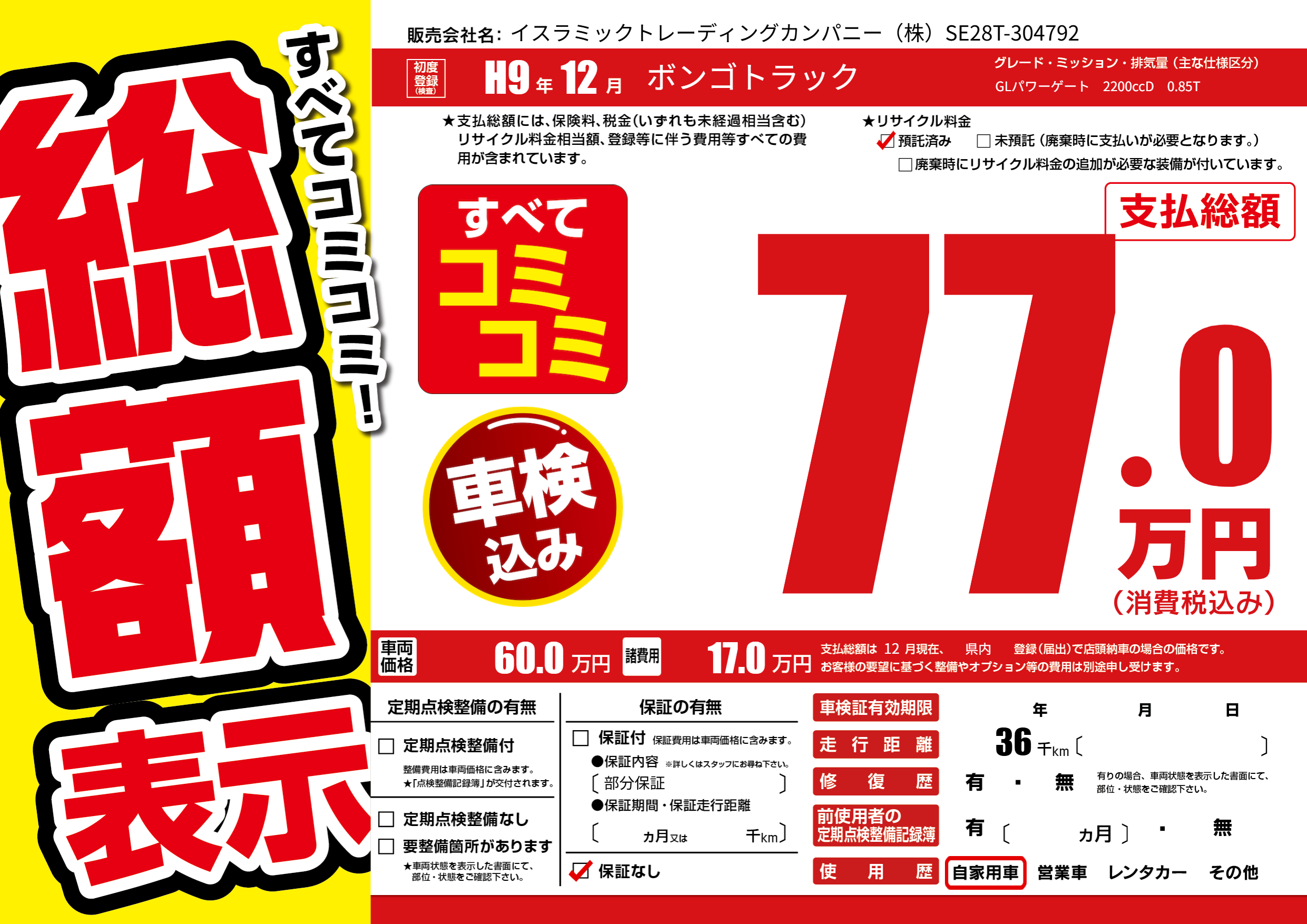 保証なし 保証内容(部分保証) ---ヶ月または()千kmまで |