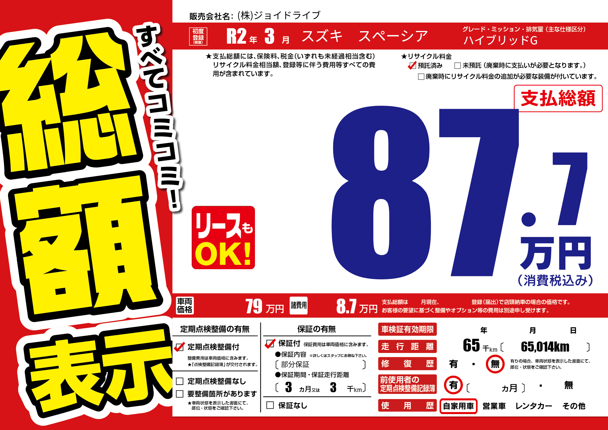 | 車名 | スズキ スペーシア | グレード ミッション 排気量 |