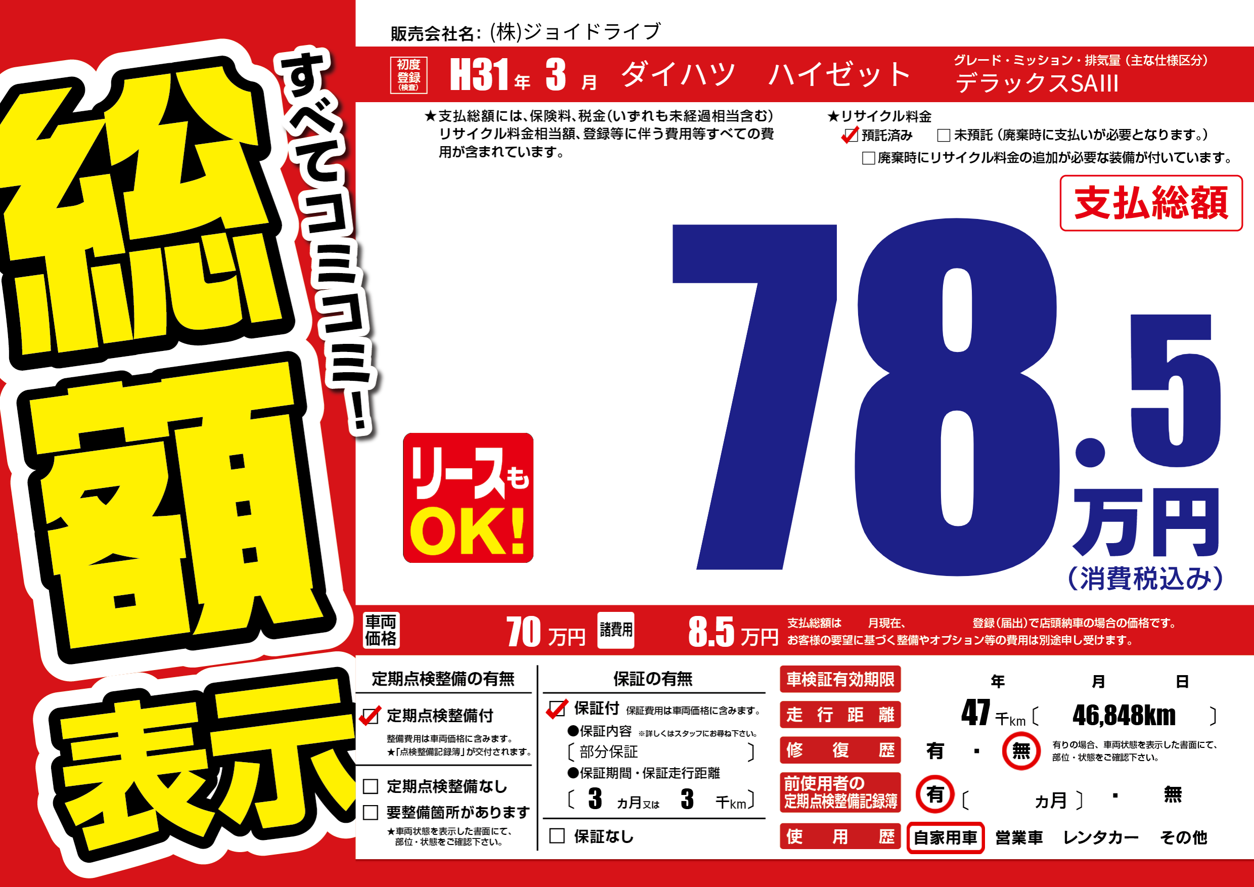 保証付き 保証内容(部分保証) 3ヶ月または(3)千kmまで |