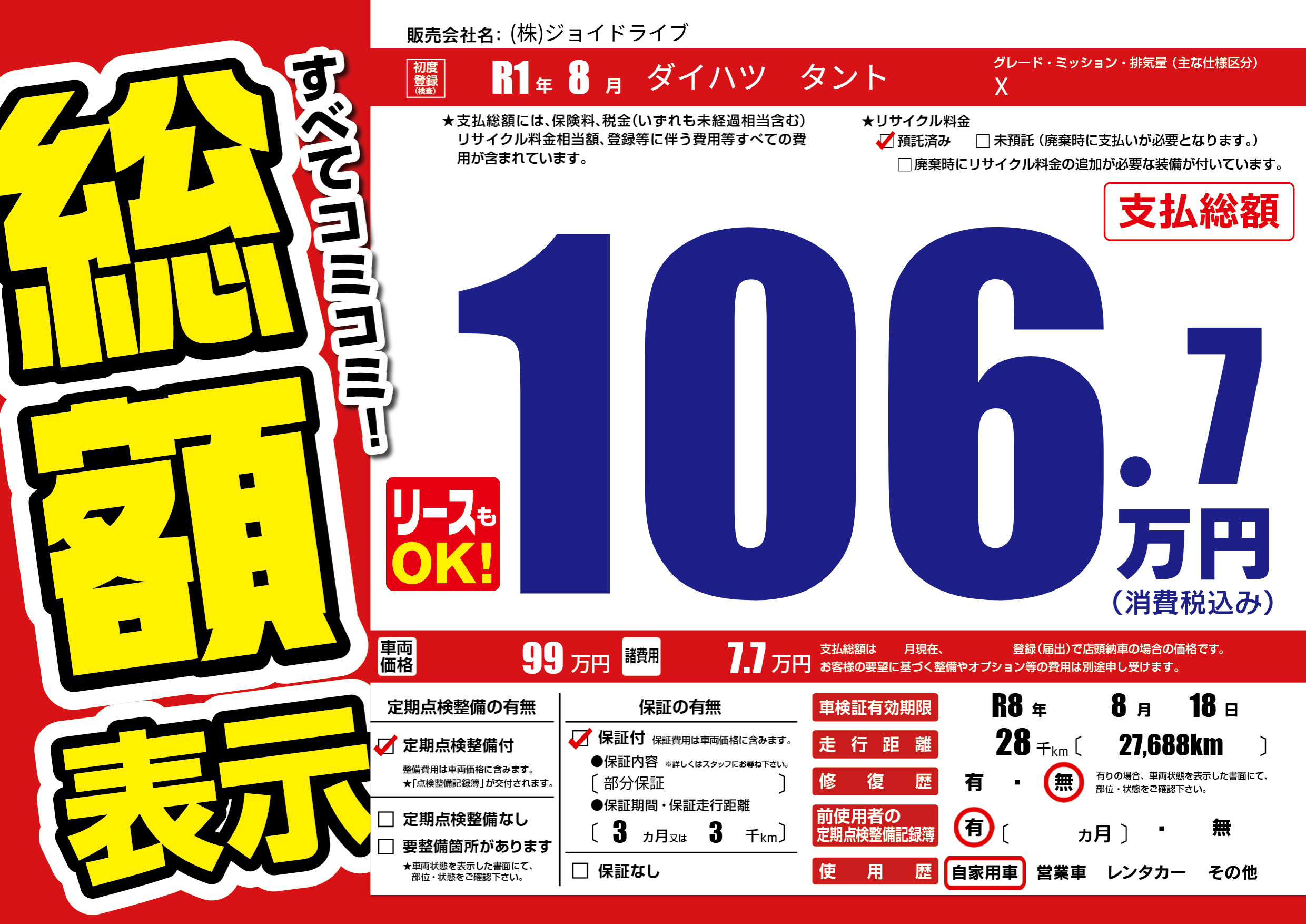| 車名 | ダイハツ タント | グレード ミッション 排気量 |
