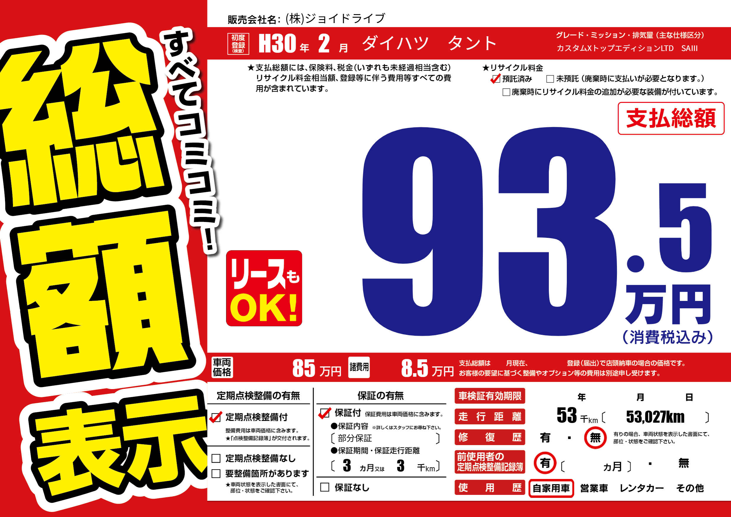 | 車名 | ダイハツ タント | グレード ミッション 排気量 |
