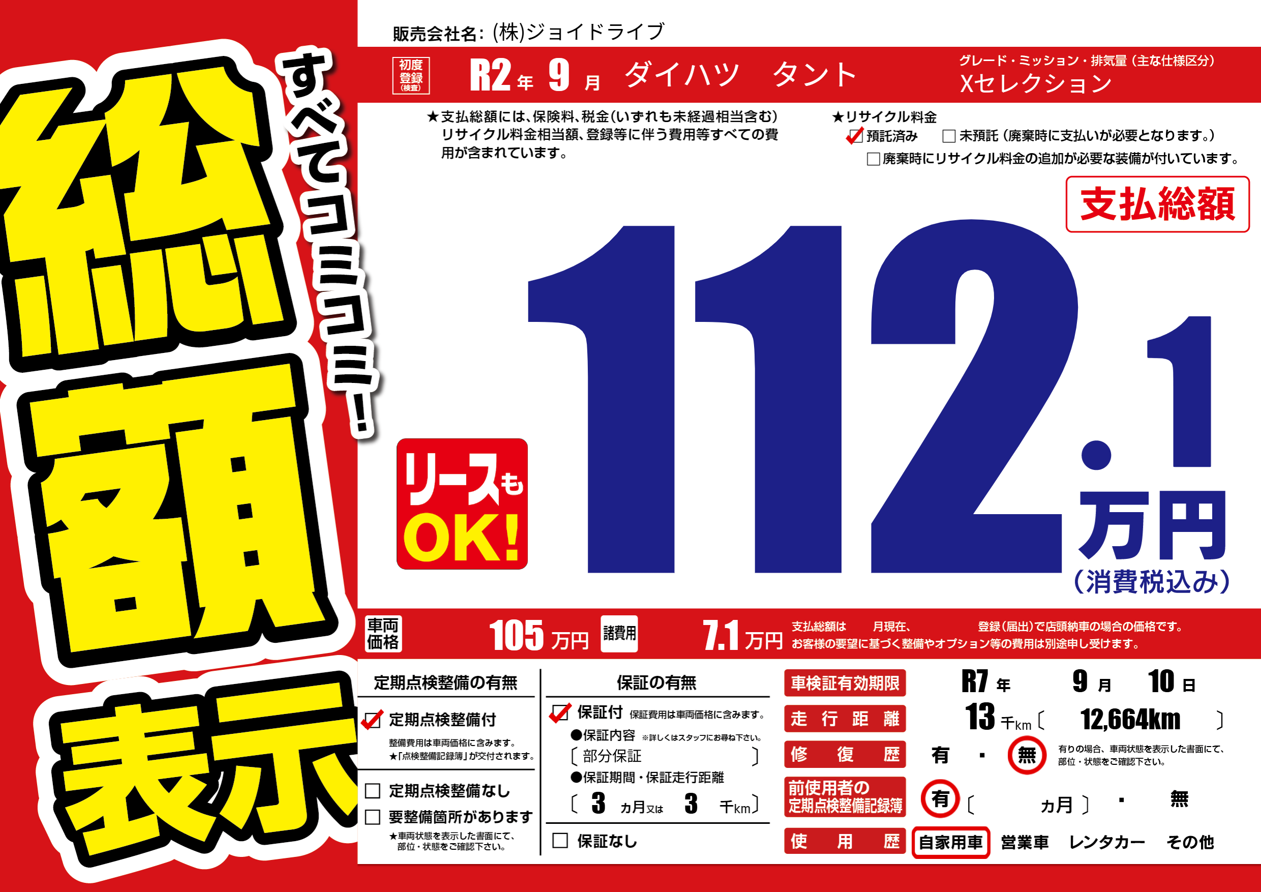 | 走行キロ | 1.3万km | 初年度登録 | R2年9月 |