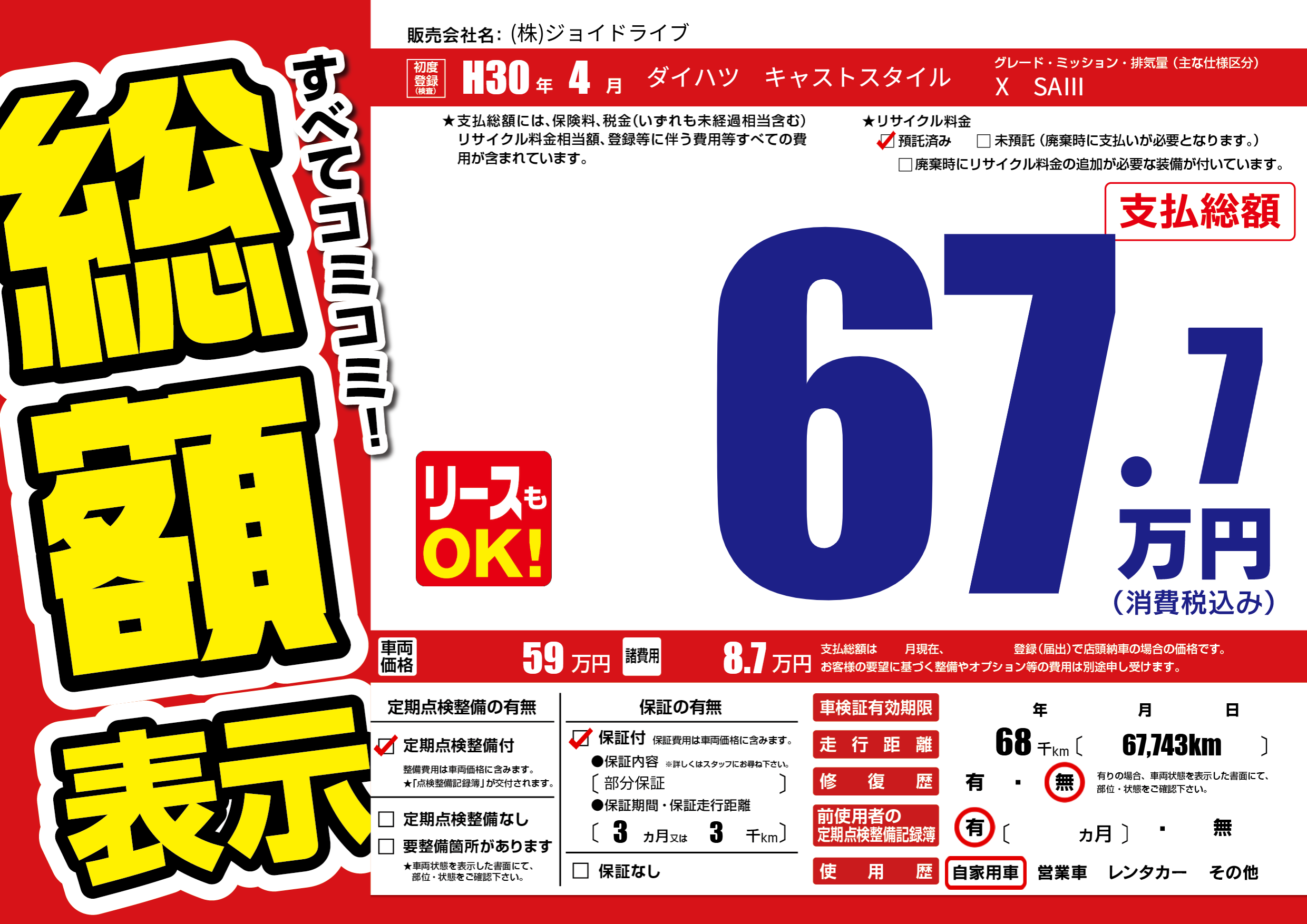 | 車名 | ダイハツ キャストスタイル | グレード ミッション 排気量 |