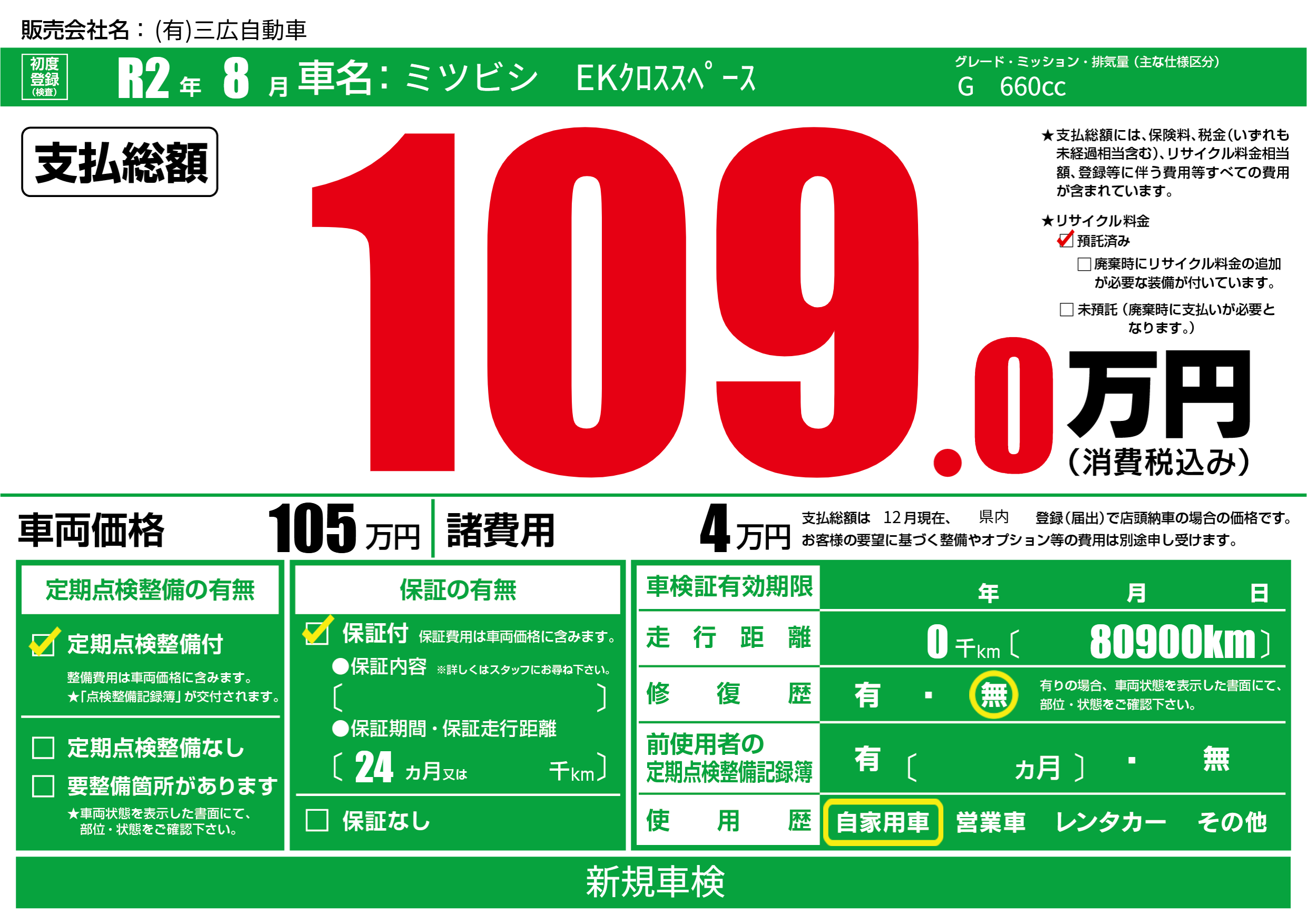 | 車名 | ミツビシ EKクロススペース | グレード ミッション 排気量 |