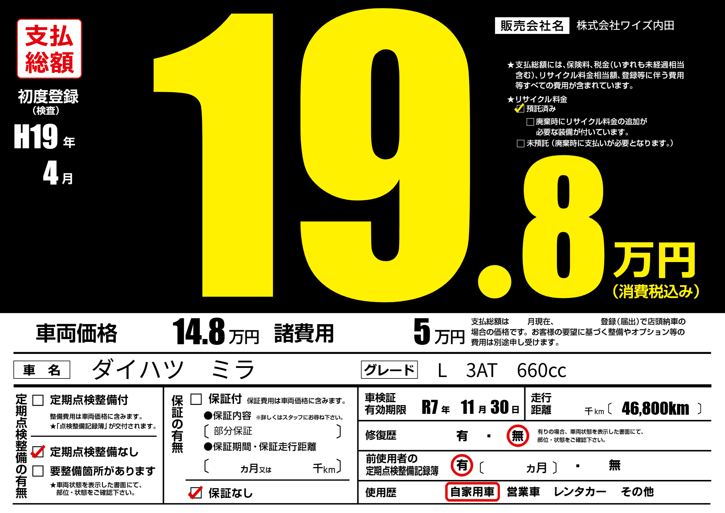 | 走行キロ | - | 初年度登録 | H19年4月 |