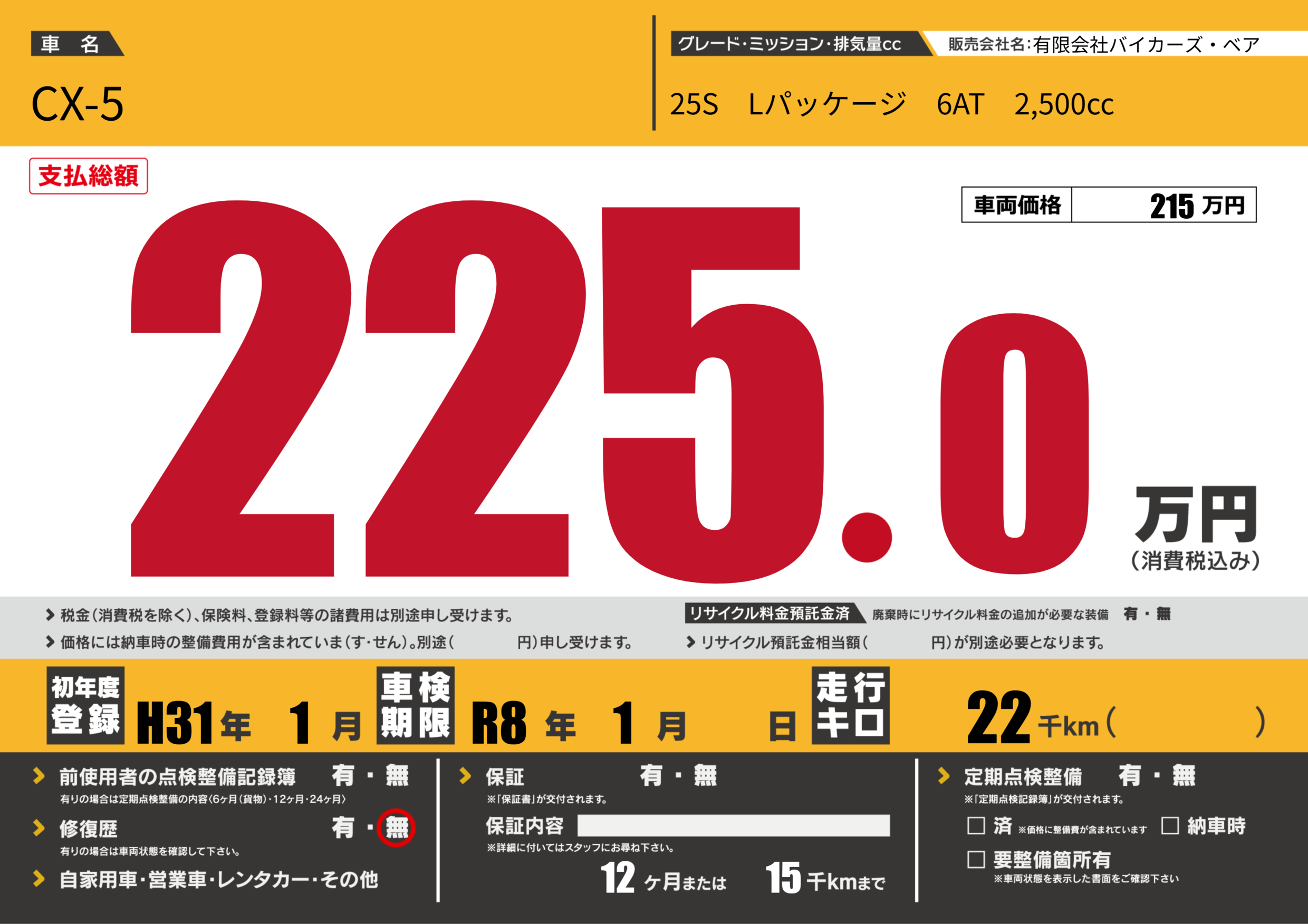 | 車名 | CX-5 | グレード ミッション 排気量 |