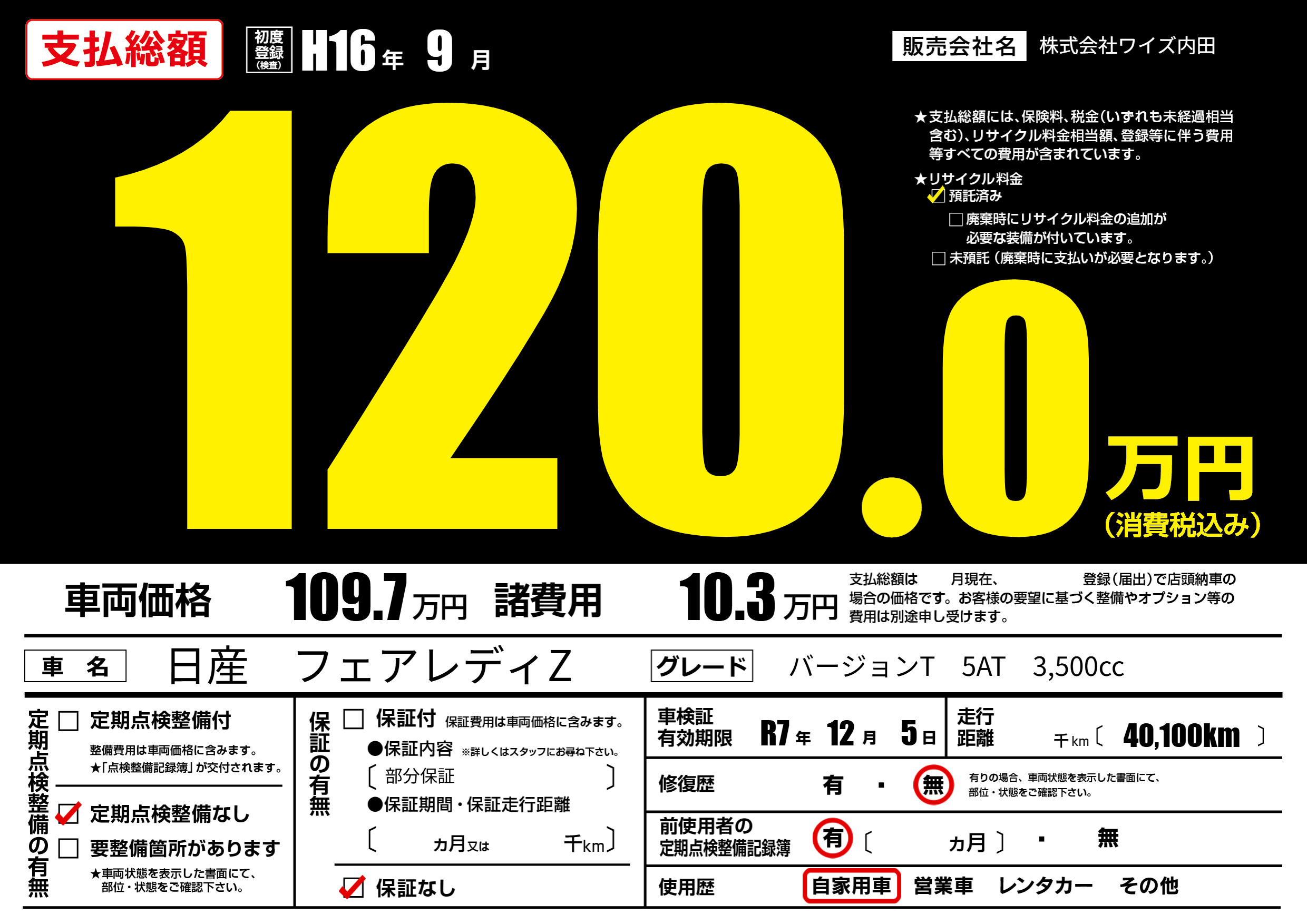 | 車名 | 日産 フェアレディZ | グレード ミッション 排気量 |