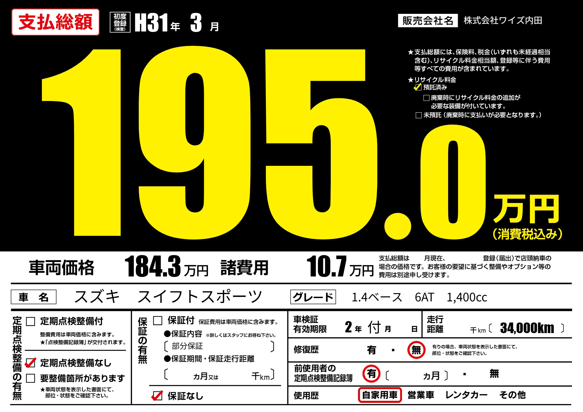 | 車名 | スズキ スイフトスポーツ | グレード ミッション 排気量 |