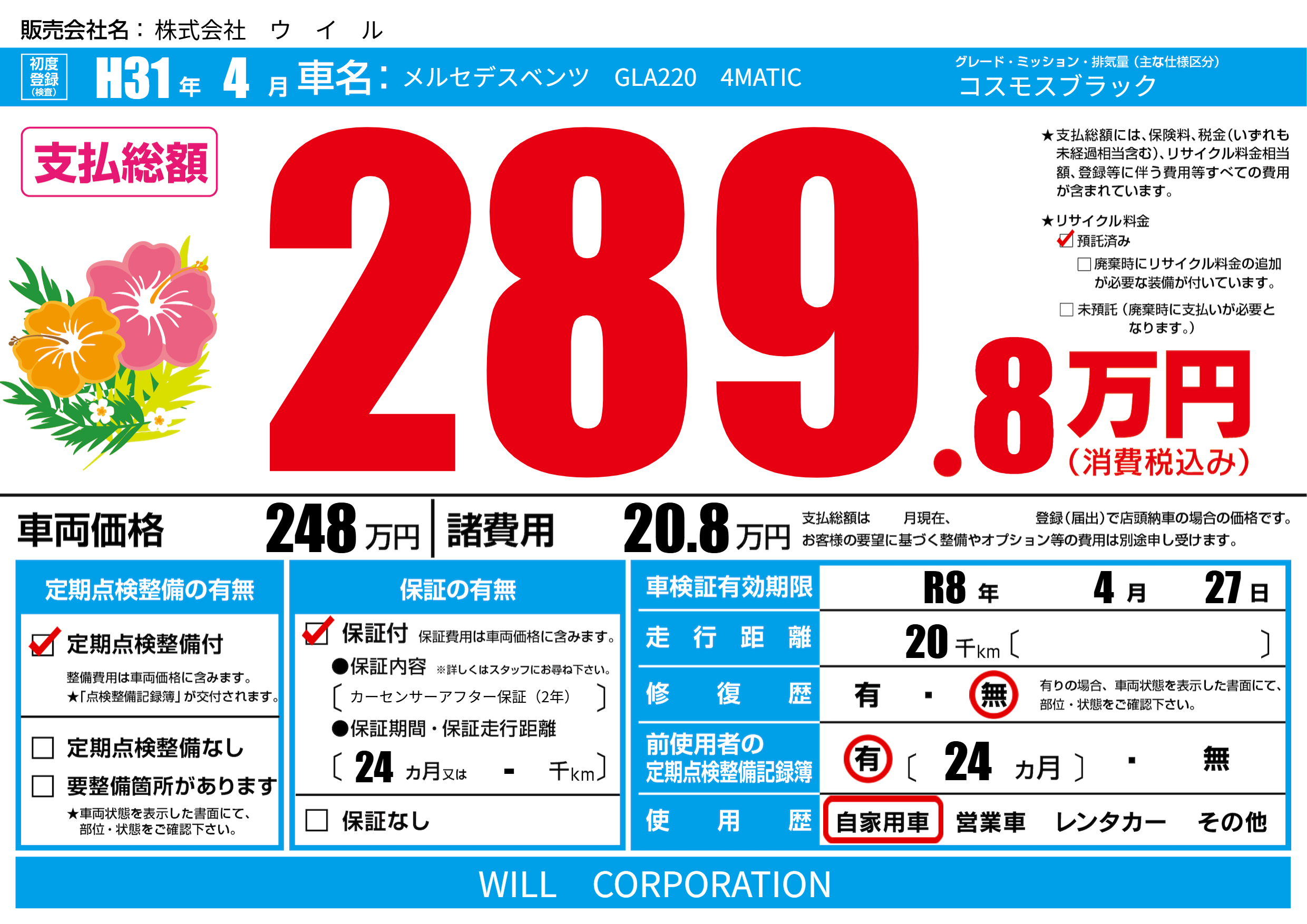 | 車名 | メルセデスベンツ GLA220 4MATIC | グレード ミッション 排気量 |