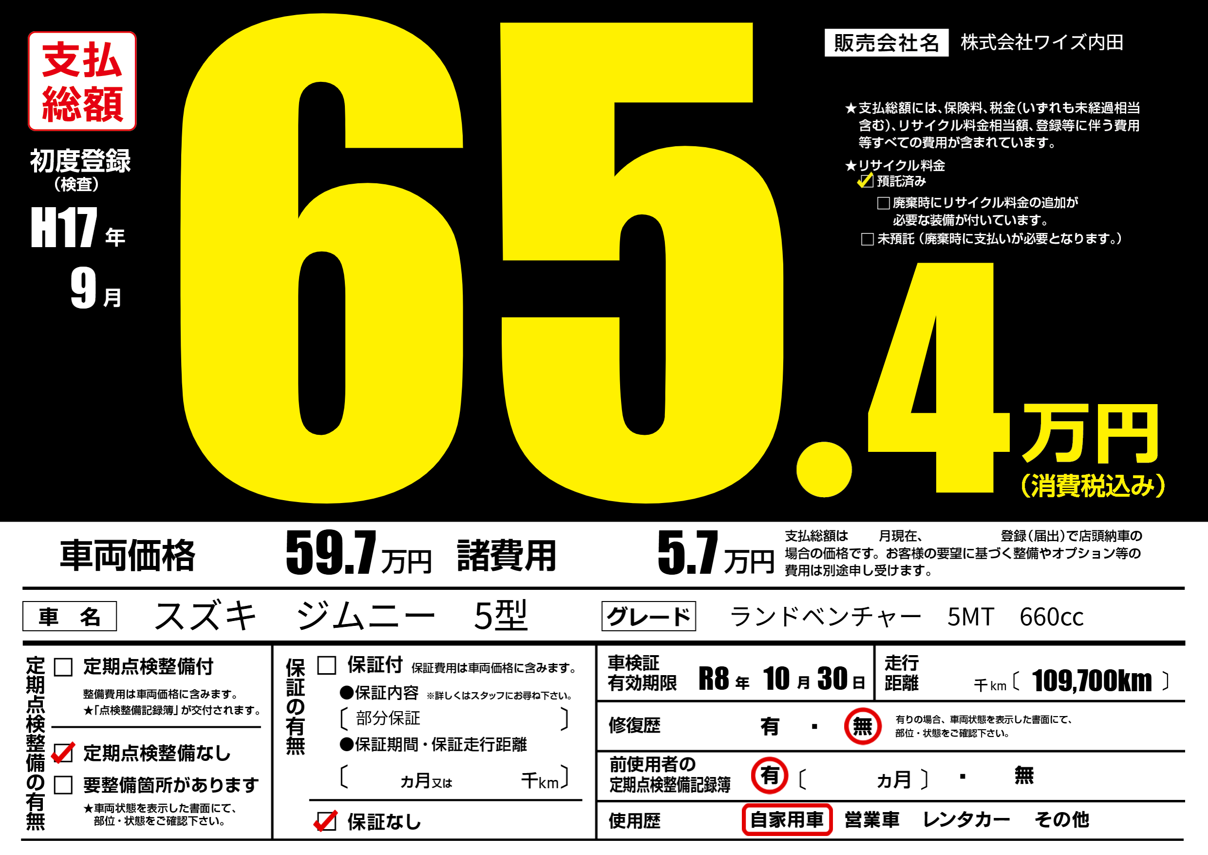 | 車名 | スズキ ジムニー 5型 | グレード ミッション 排気量 |