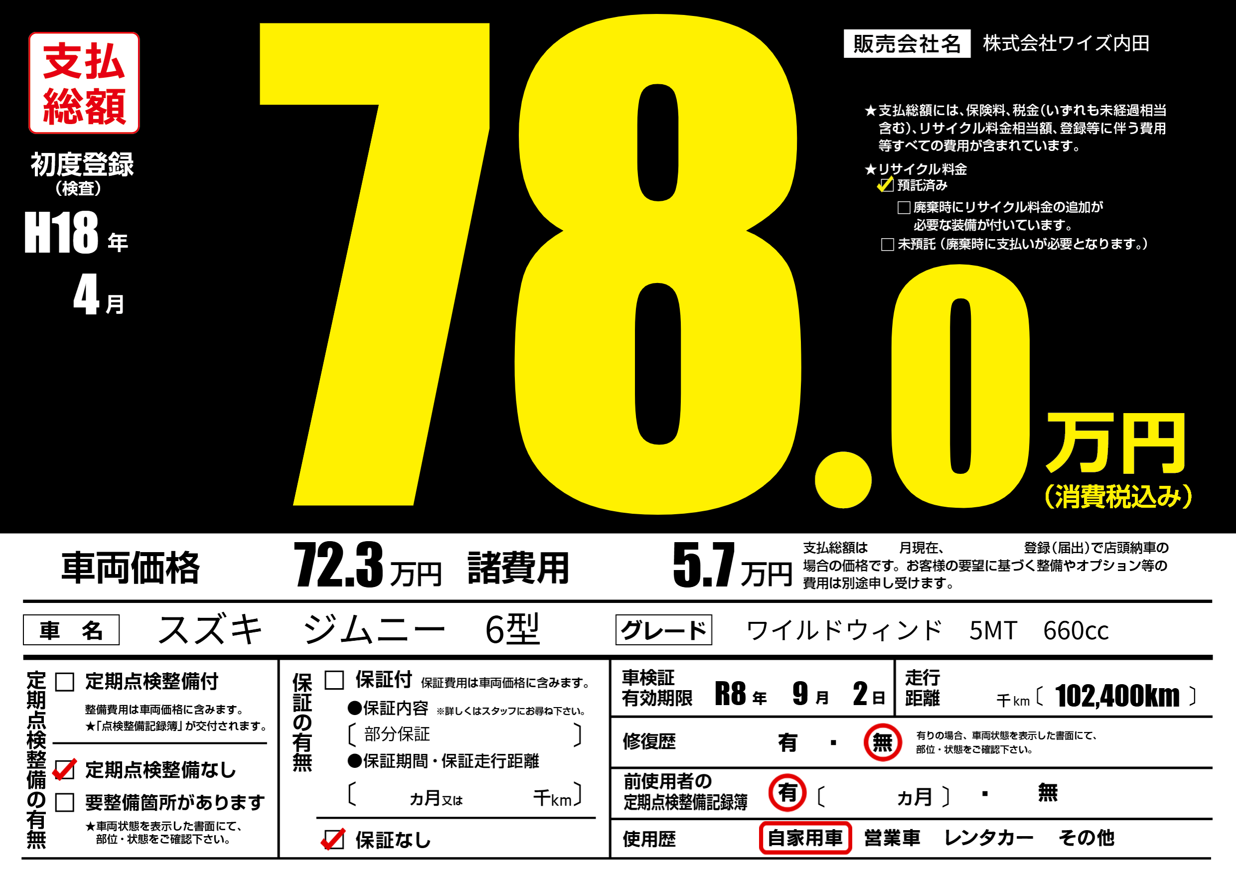 | 車名 | スズキ ジムニー 6型 | グレード ミッション 排気量 |