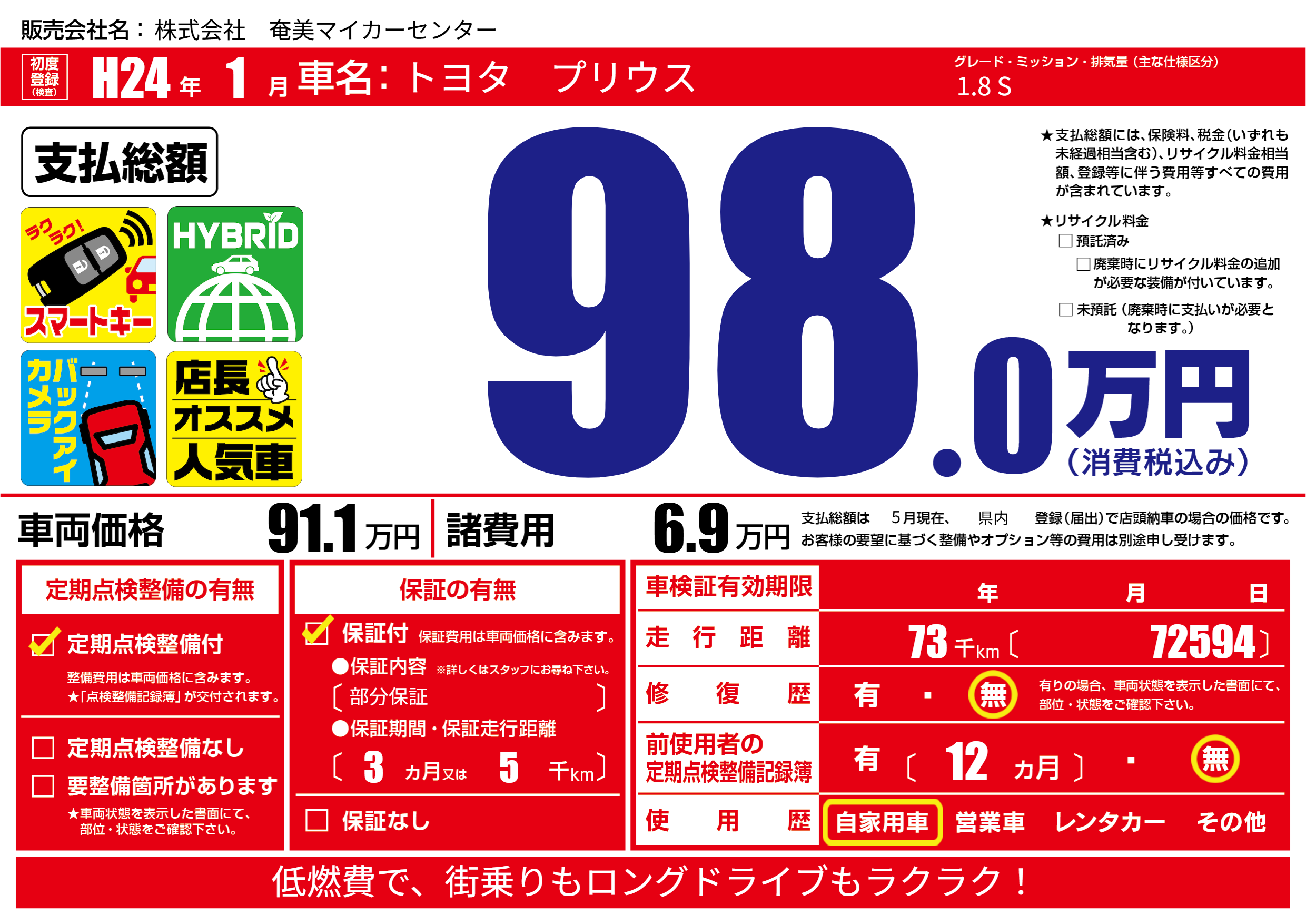 | 走行キロ | 7.3万km | 初年度登録 | H24年1月 |