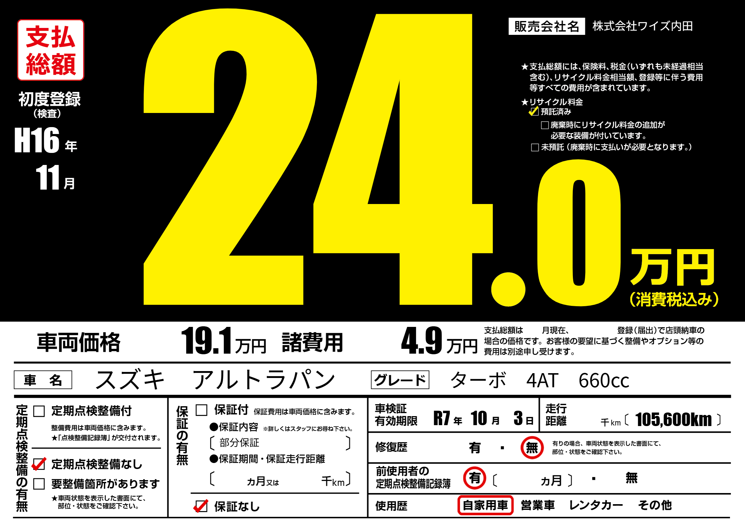 | 走行キロ | - | 初年度登録 | H16年11月 |