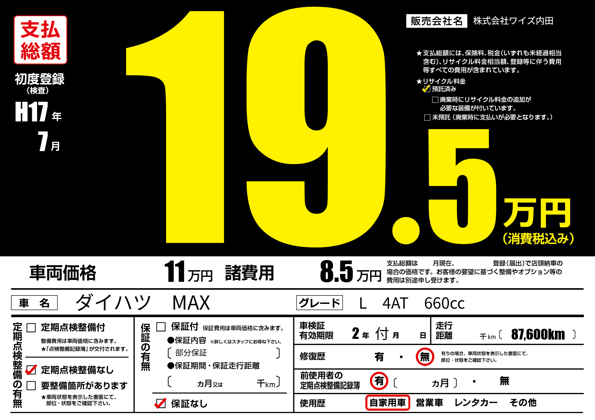 | 車名 | ダイハツ MAX | グレード ミッション 排気量 |