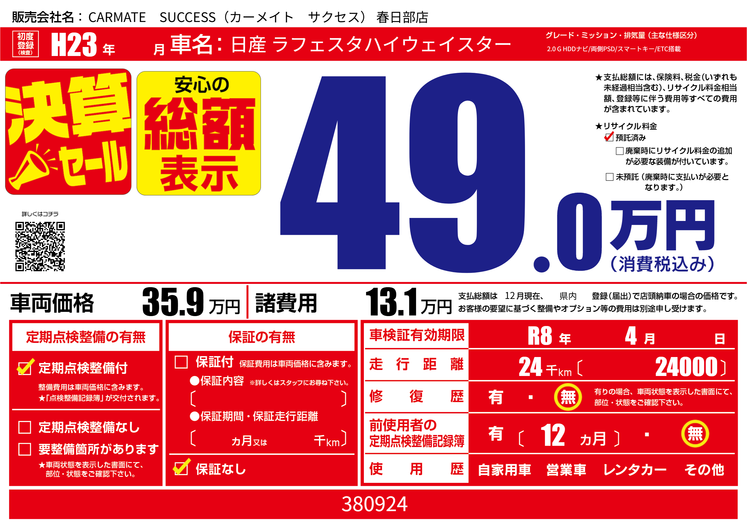 | 車名 | 日産 ラフェスタハイウェイスター | グレード ミッション 排気量 |