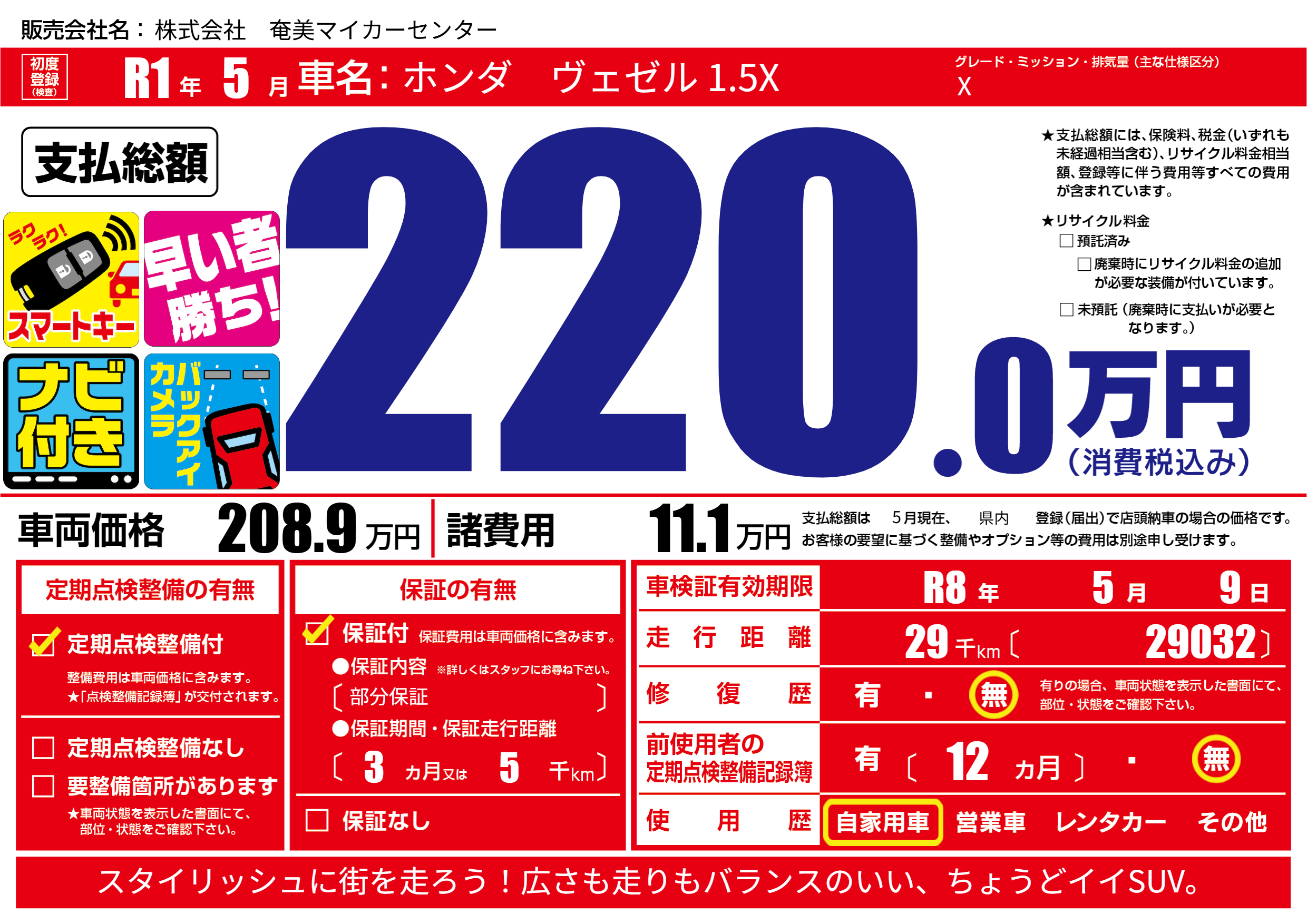 | 車名 | ホンダ ヴェゼル 1.5X | グレード ミッション 排気量 |