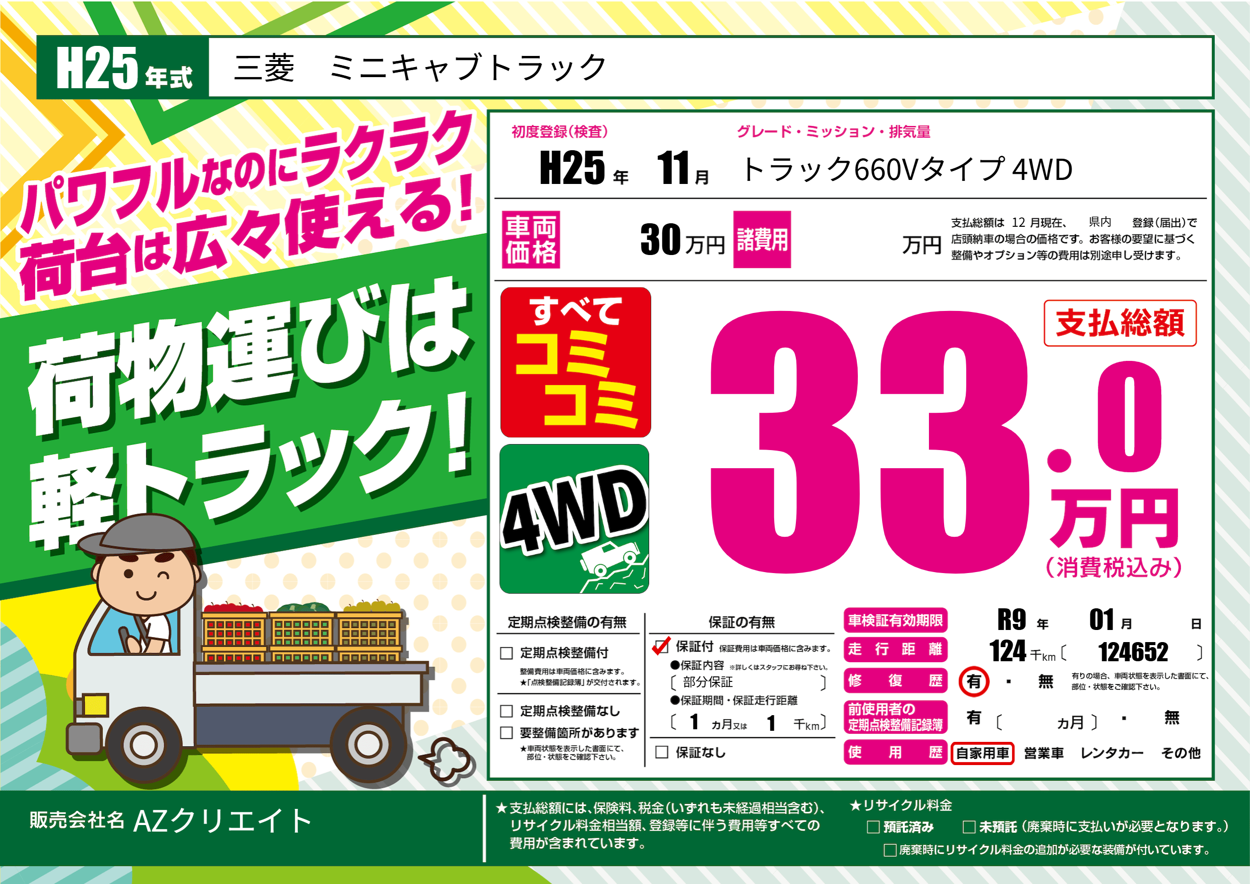 | 走行キロ | 12.4万km | 初年度登録 | H25年11月 |