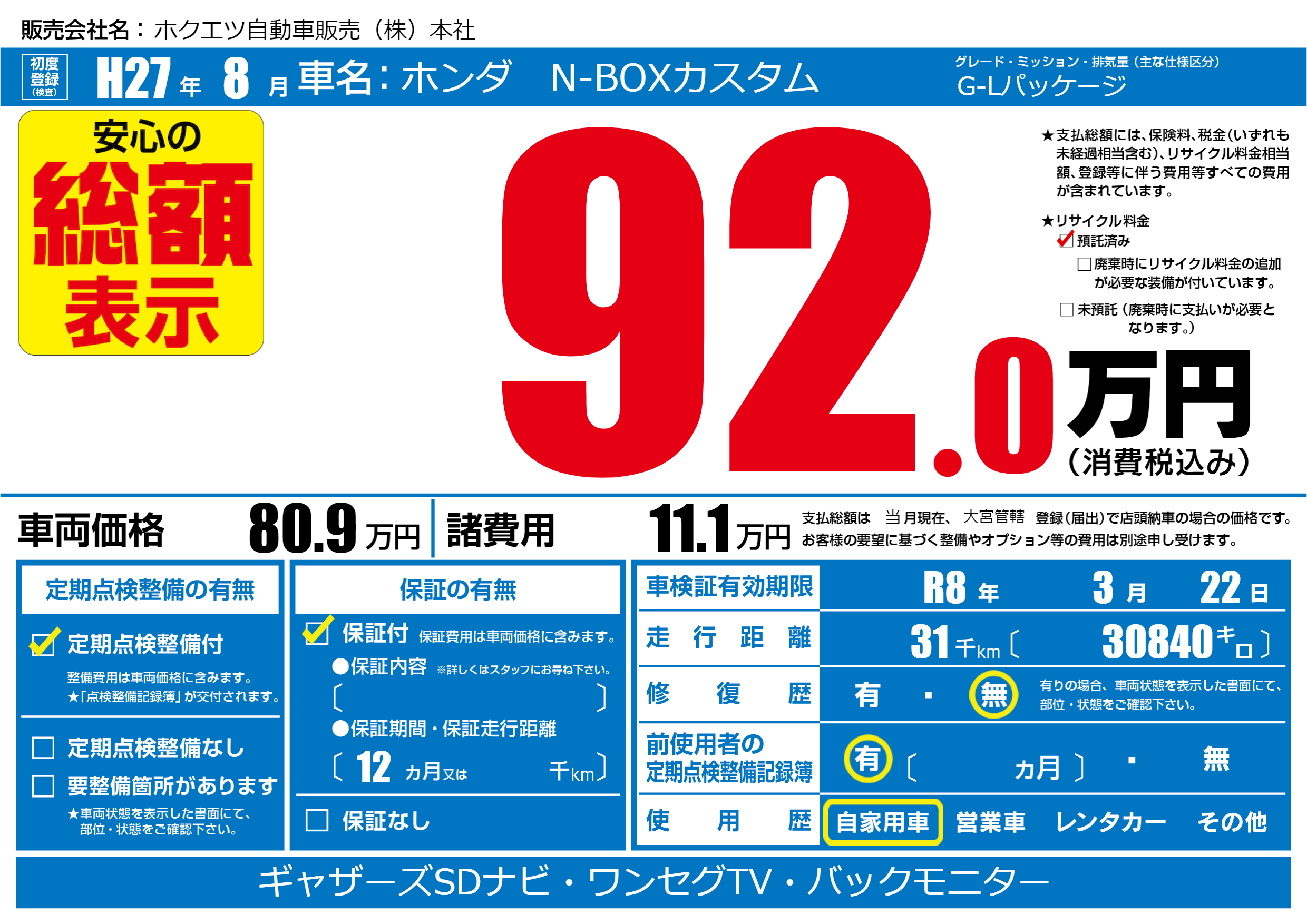 | 車名 | ホンダ N-BOXカスタム | グレード ミッション 排気量 |