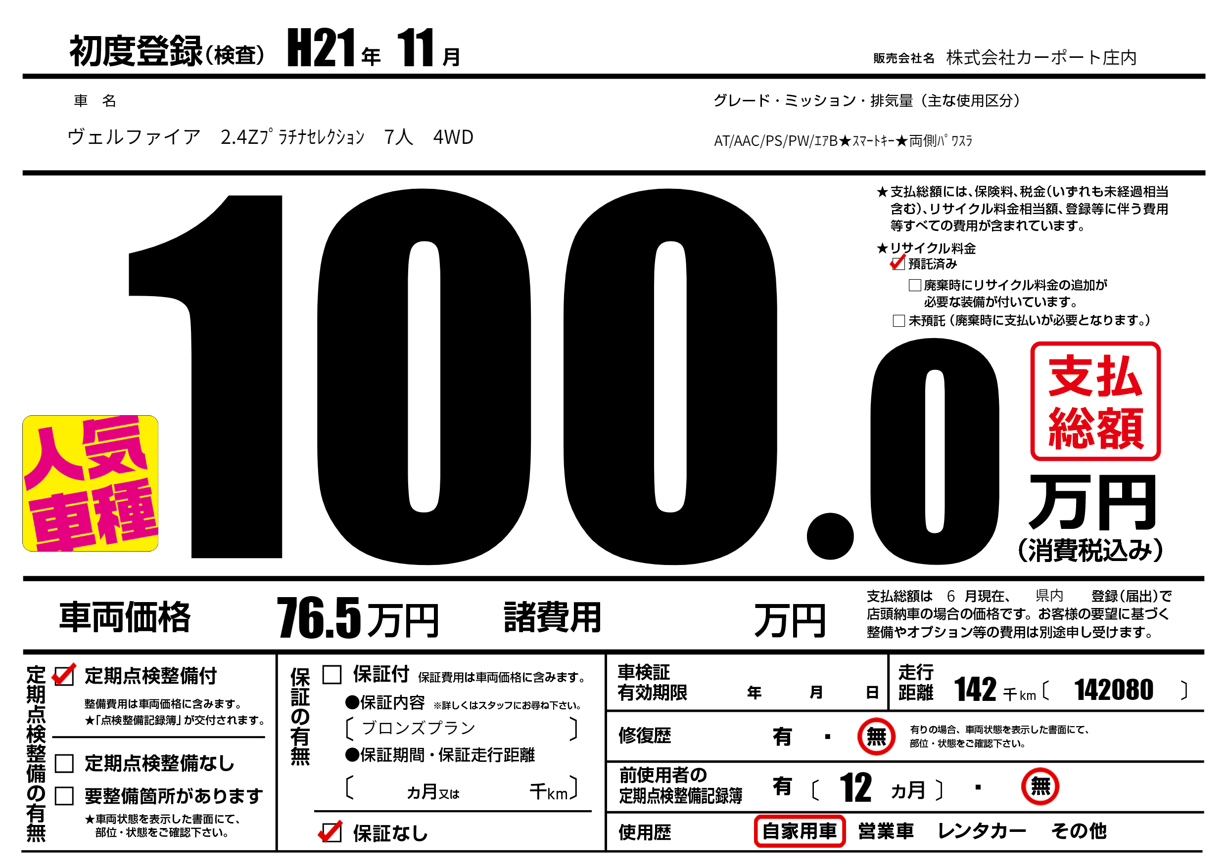 | 車名 | ヴェルファイア 2.4Zプラチナセレクション 7人 4WD | グレード ミッション 排気量 |
